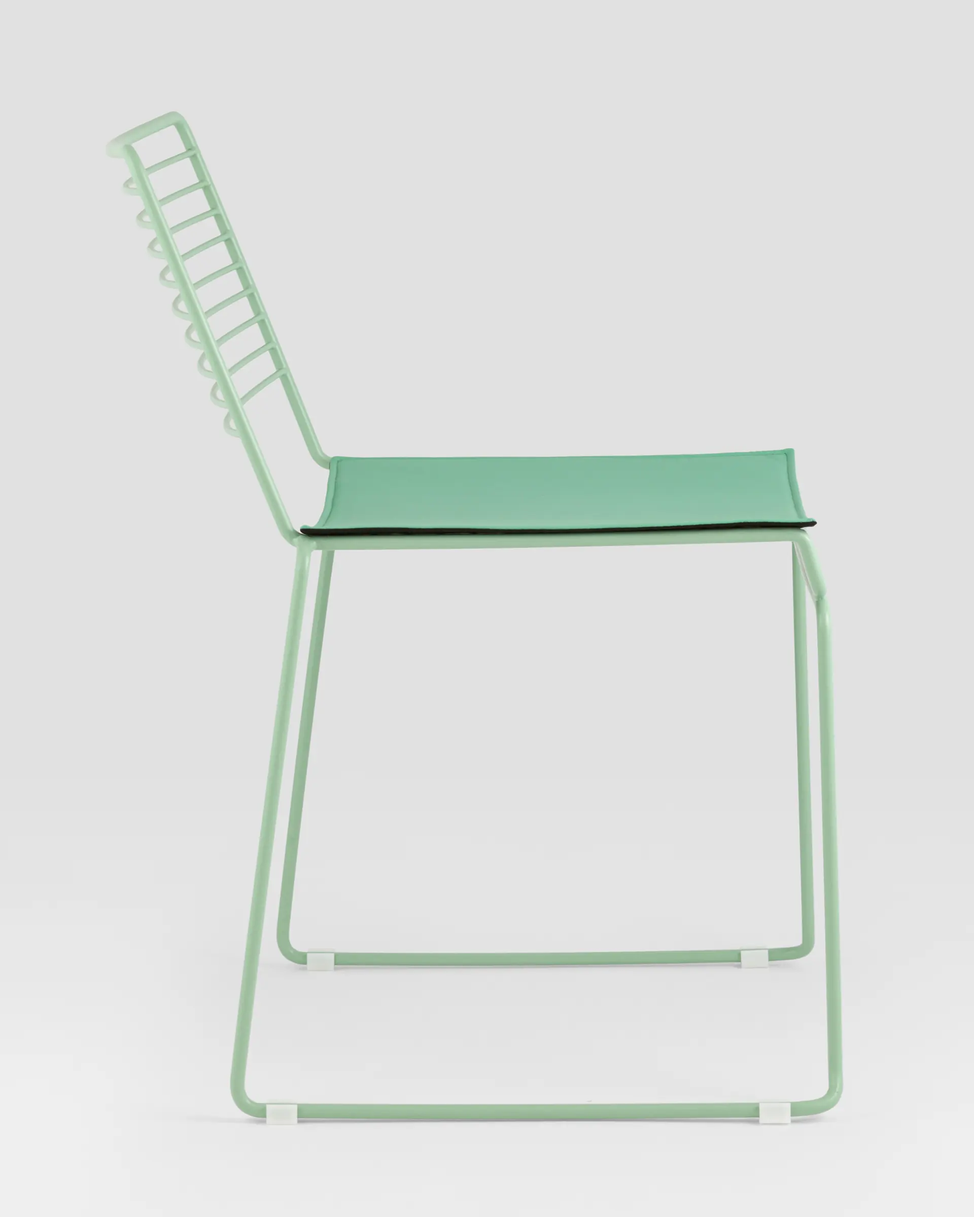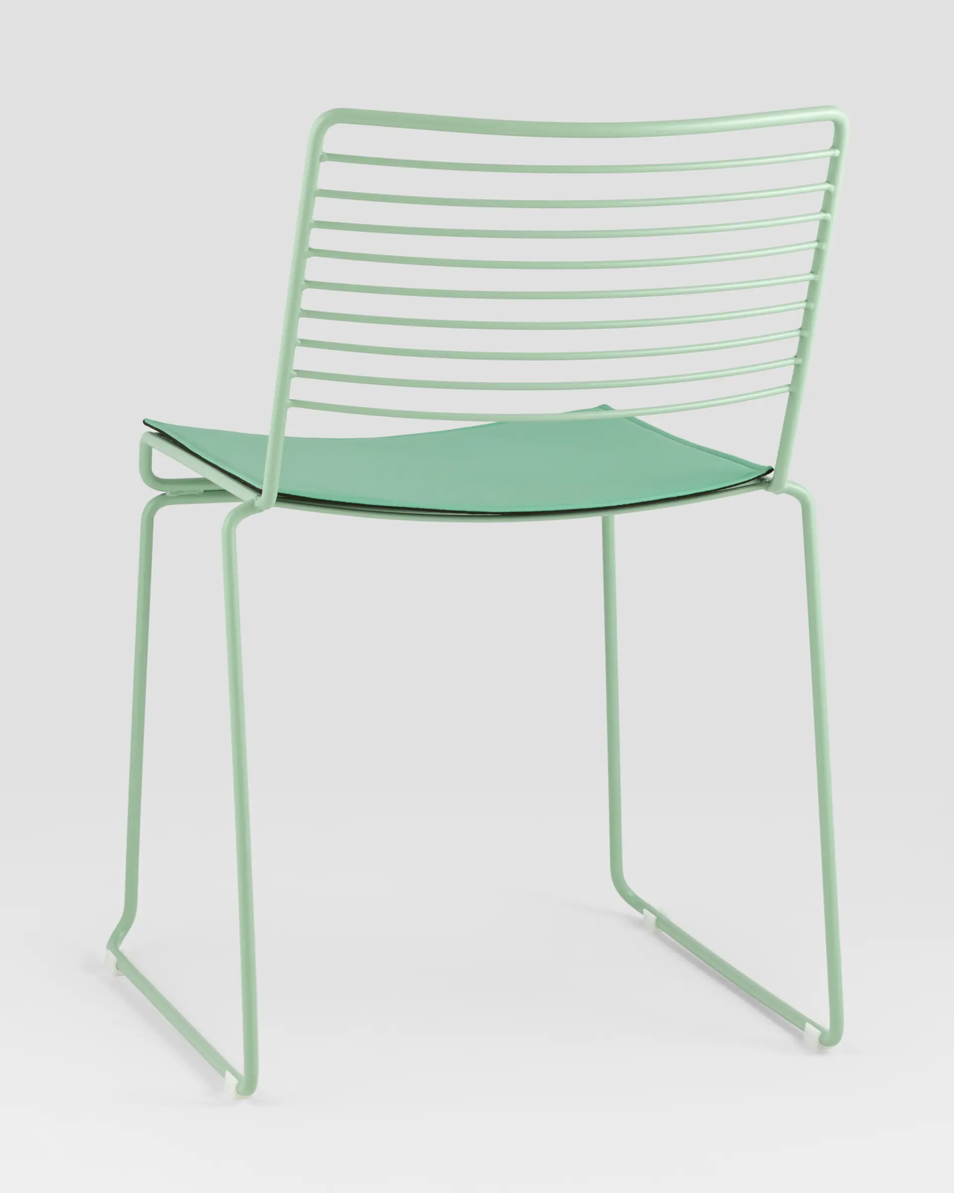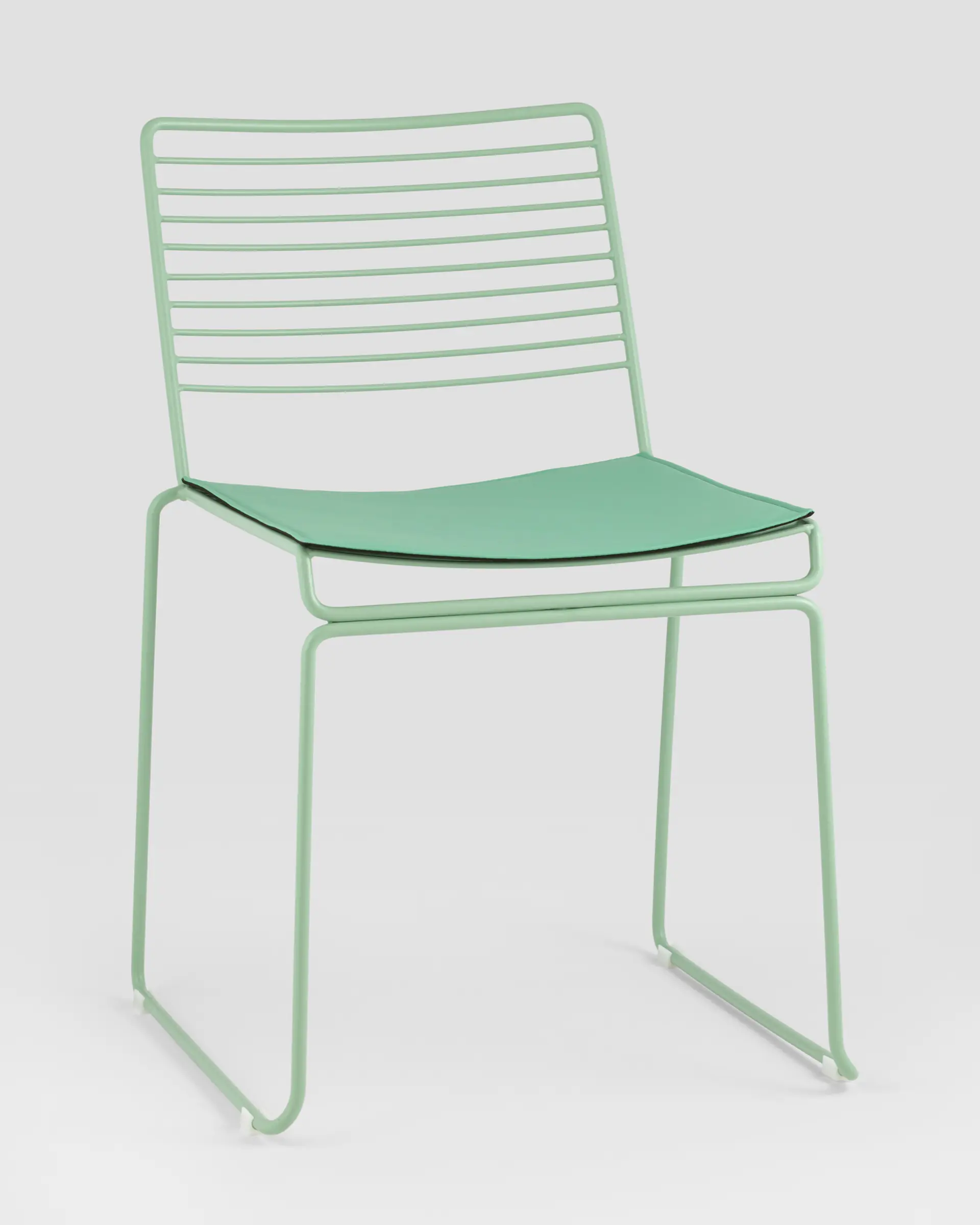 Современная модель стула Danny подходит как для интерьера обеденной зоны дома, так и для кафе или ресторана. Спинка и сидение выполнены из металлических прутьев зеленого цвета. Подушка изготовлена из экокожи в тон каркасу. Ножки выполнены из металла в тон сидения и имеют подставки, которые предотвращают скольжение по поверхности пола.