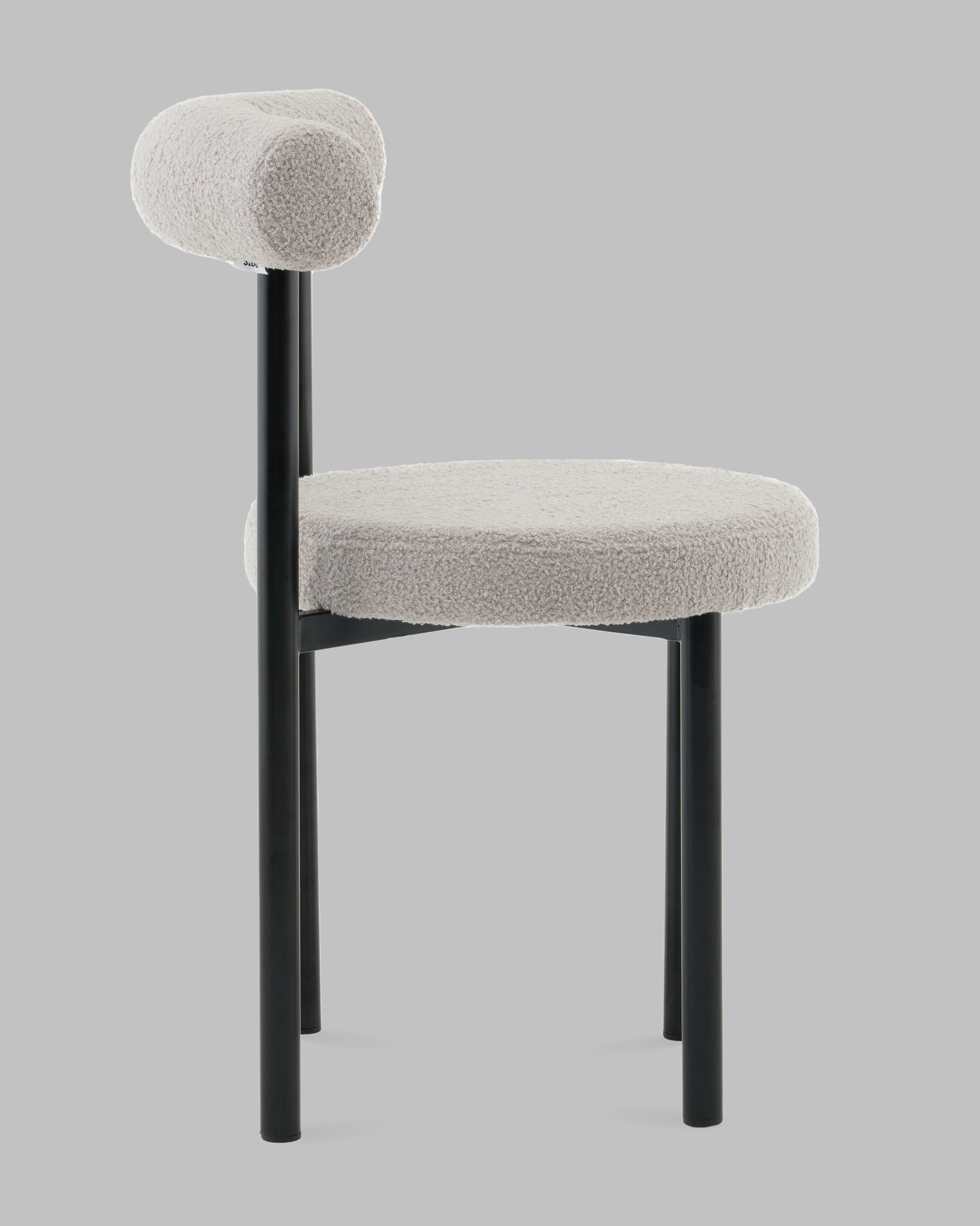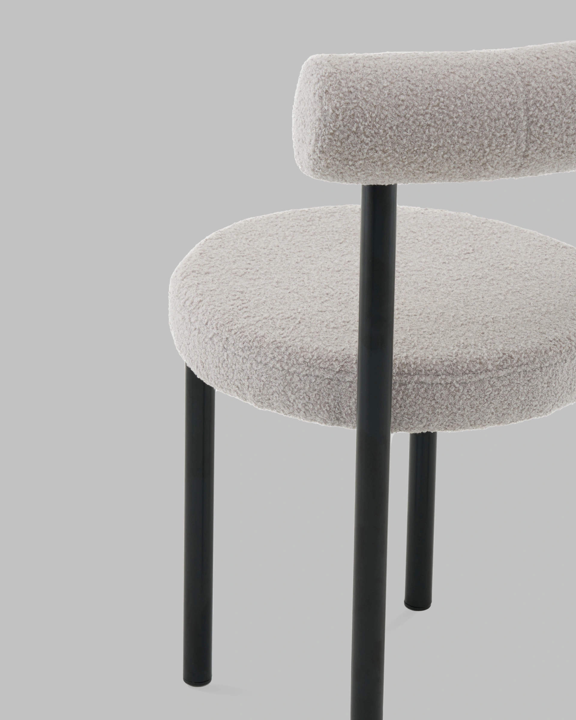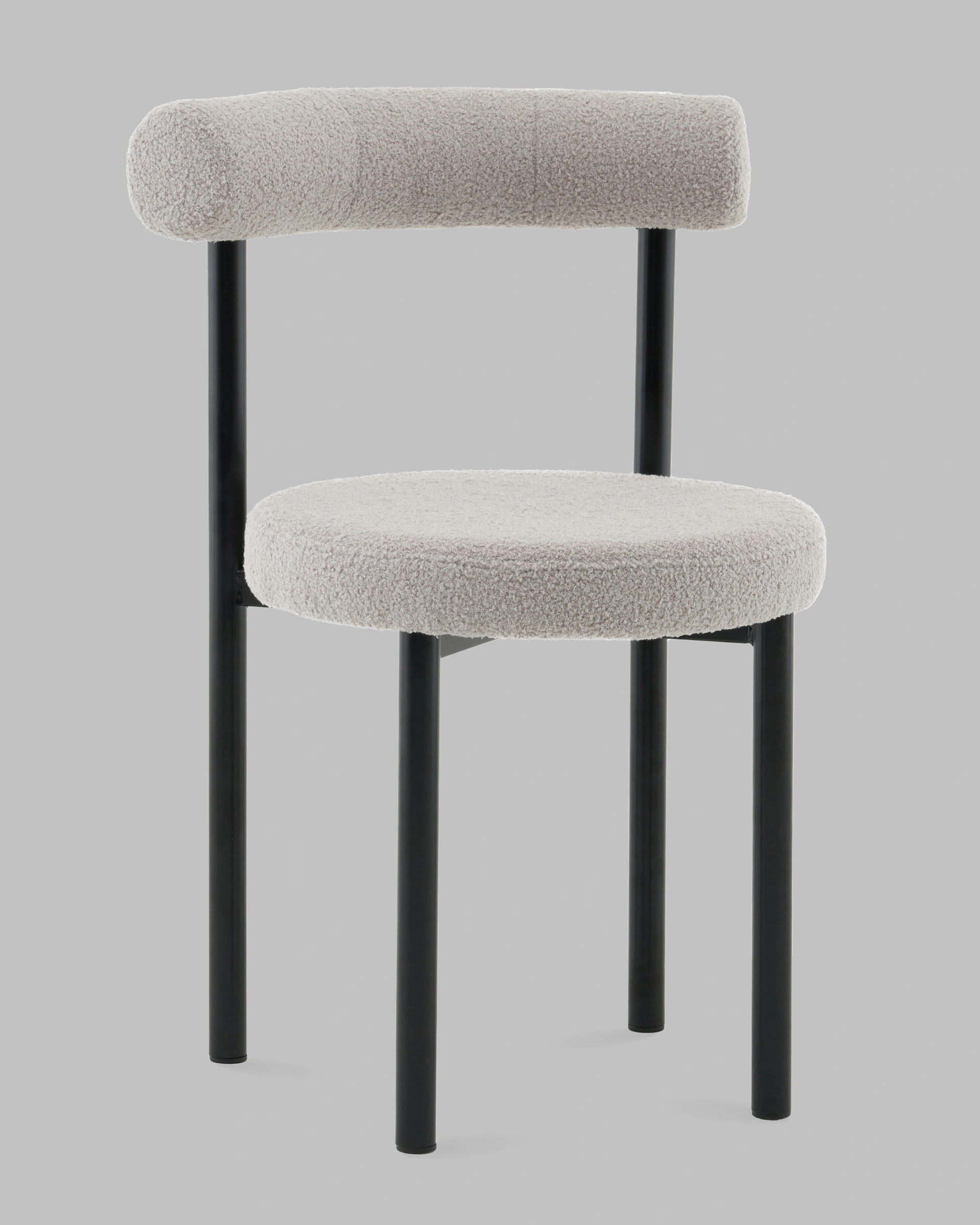 Обеденный стулФлорео— это удачное сочетание минималистичного дизайна и уютной текстуры. Обивка из светло-серого букле делает модель мягкой и приятной на ощупь, добавляя светлый акцент в интерьер. Чёрный металлический каркас подчёркивает геометрию и придаёт образу современный характер.