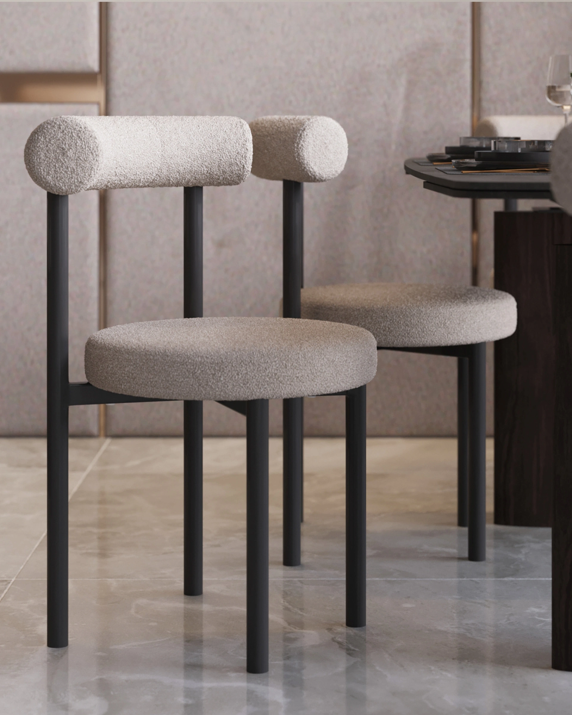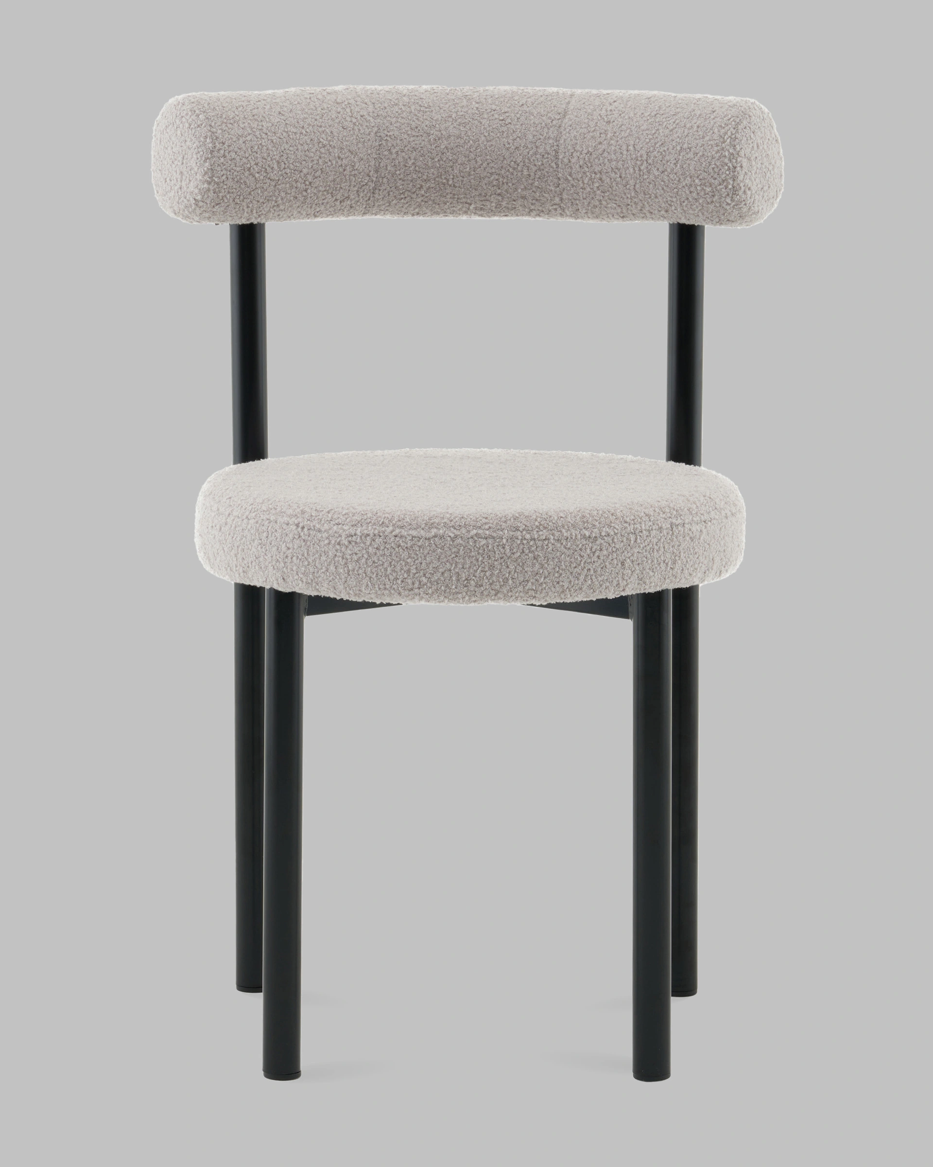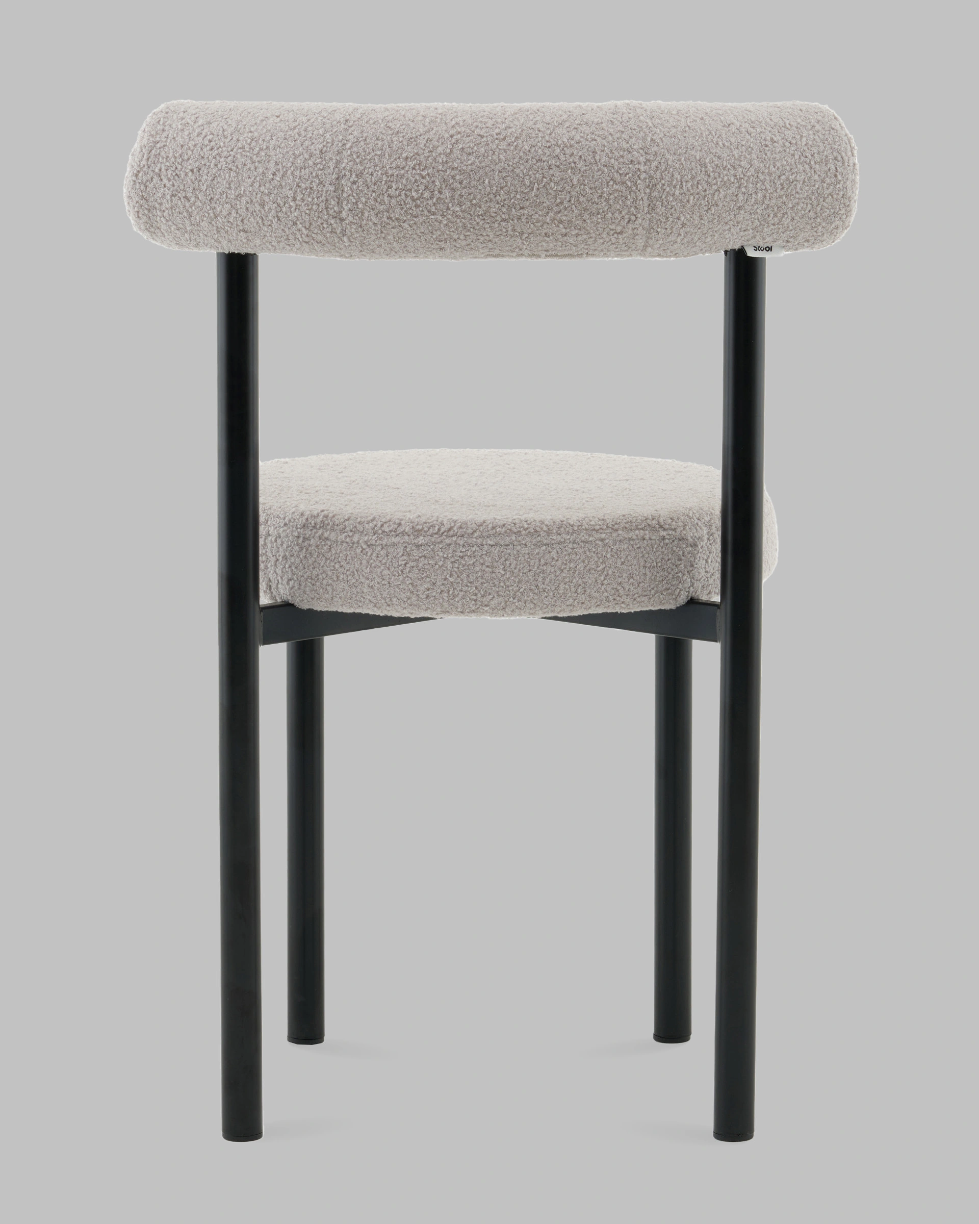 Обеденный стулФлорео— это удачное сочетание минималистичного дизайна и уютной текстуры. Обивка из светло-серого букле делает модель мягкой и приятной на ощупь, добавляя светлый акцент в интерьер. Чёрный металлический каркас подчёркивает геометрию и придаёт образу современный характер.