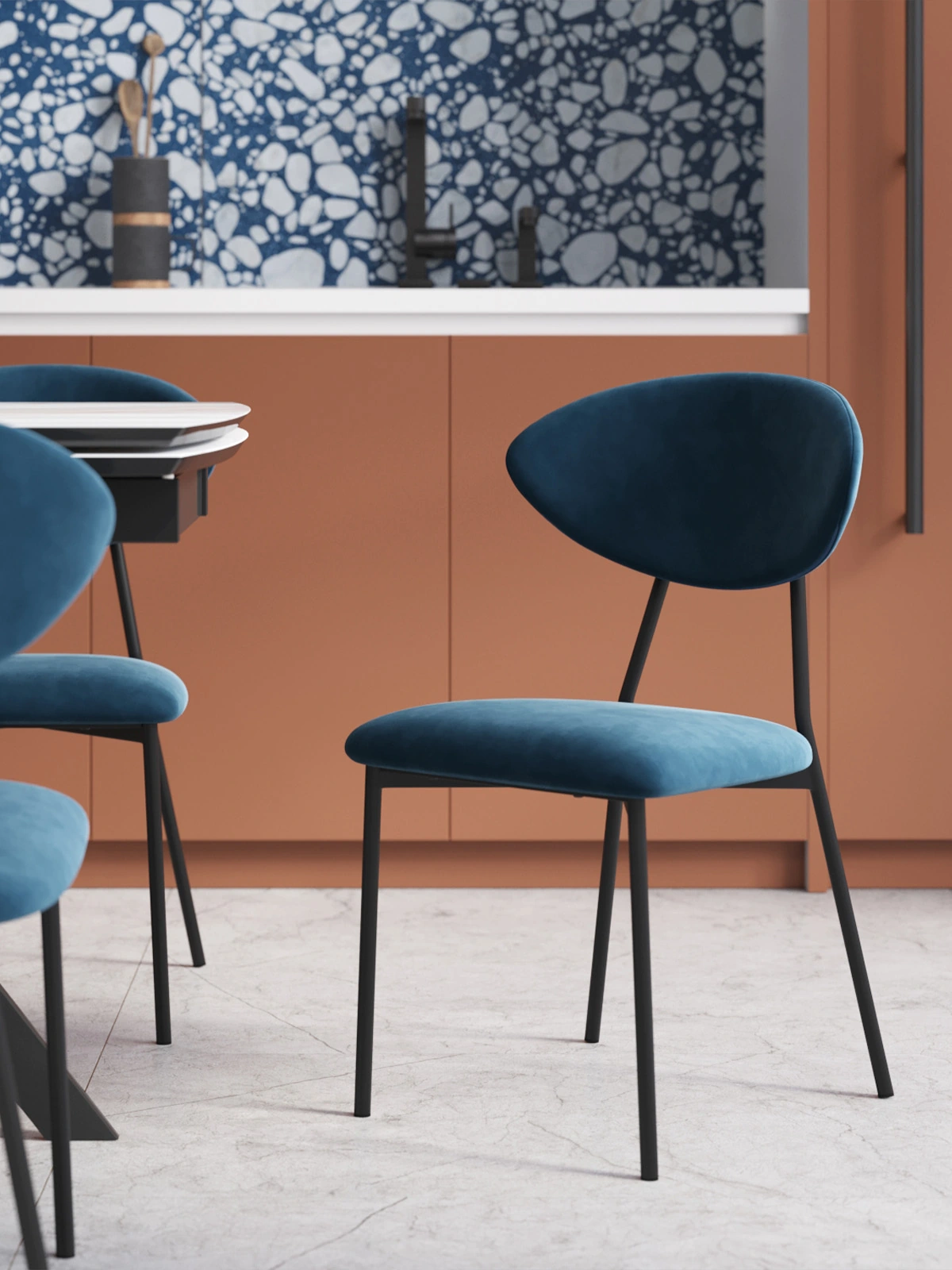 Удобство и надёжность в эксплуатации.Металлический каркас с чёрным матовым покрытием обеспечивает прочность и устойчивость. Обивка выполнена из мягкого на ощупь велюра, который придаёт стулу благородный внешний вид и лёгкость в уходе. Сиденье и спинка наполнены ППУ, обеспечивая приятную поддержку при длительном сидении.
