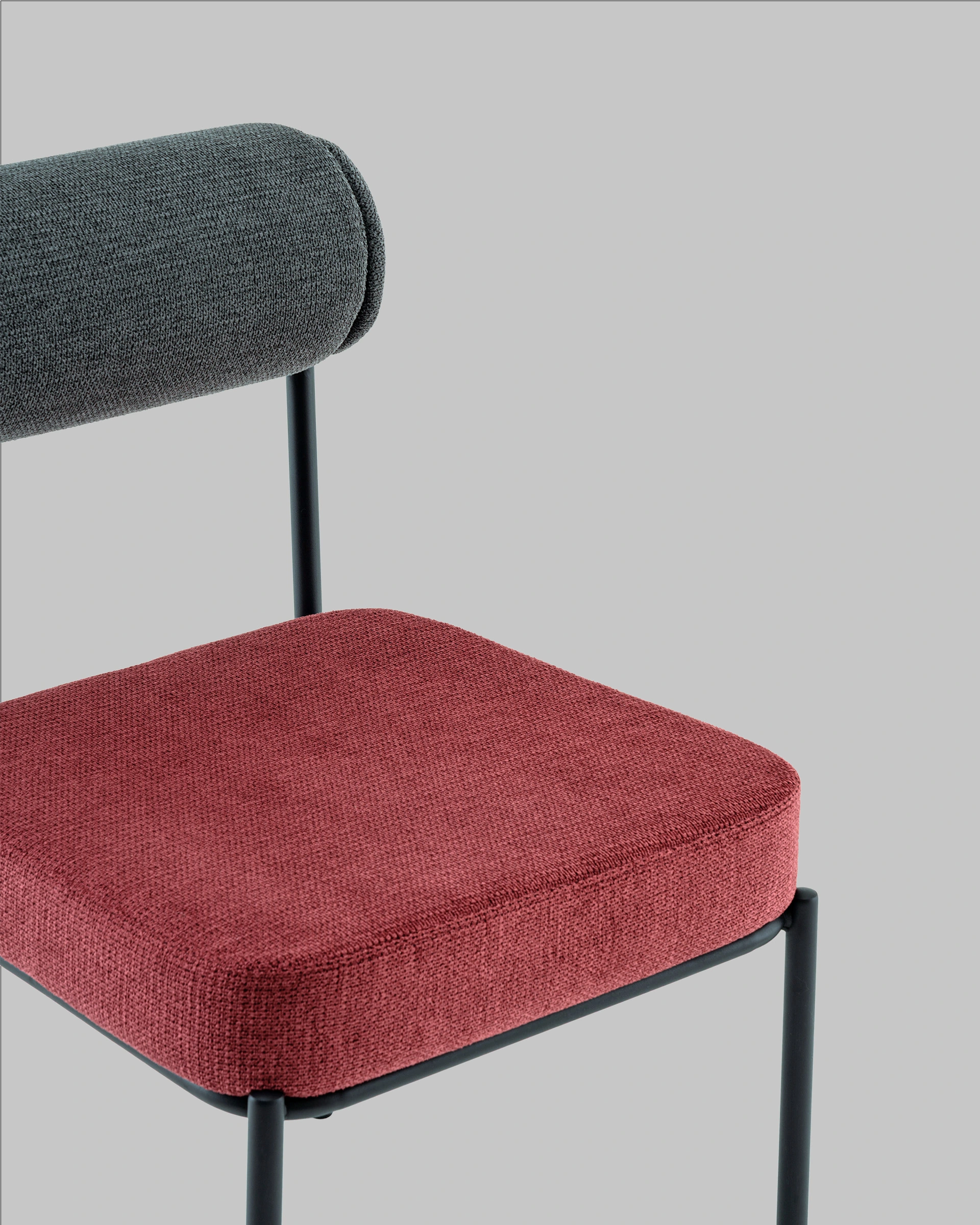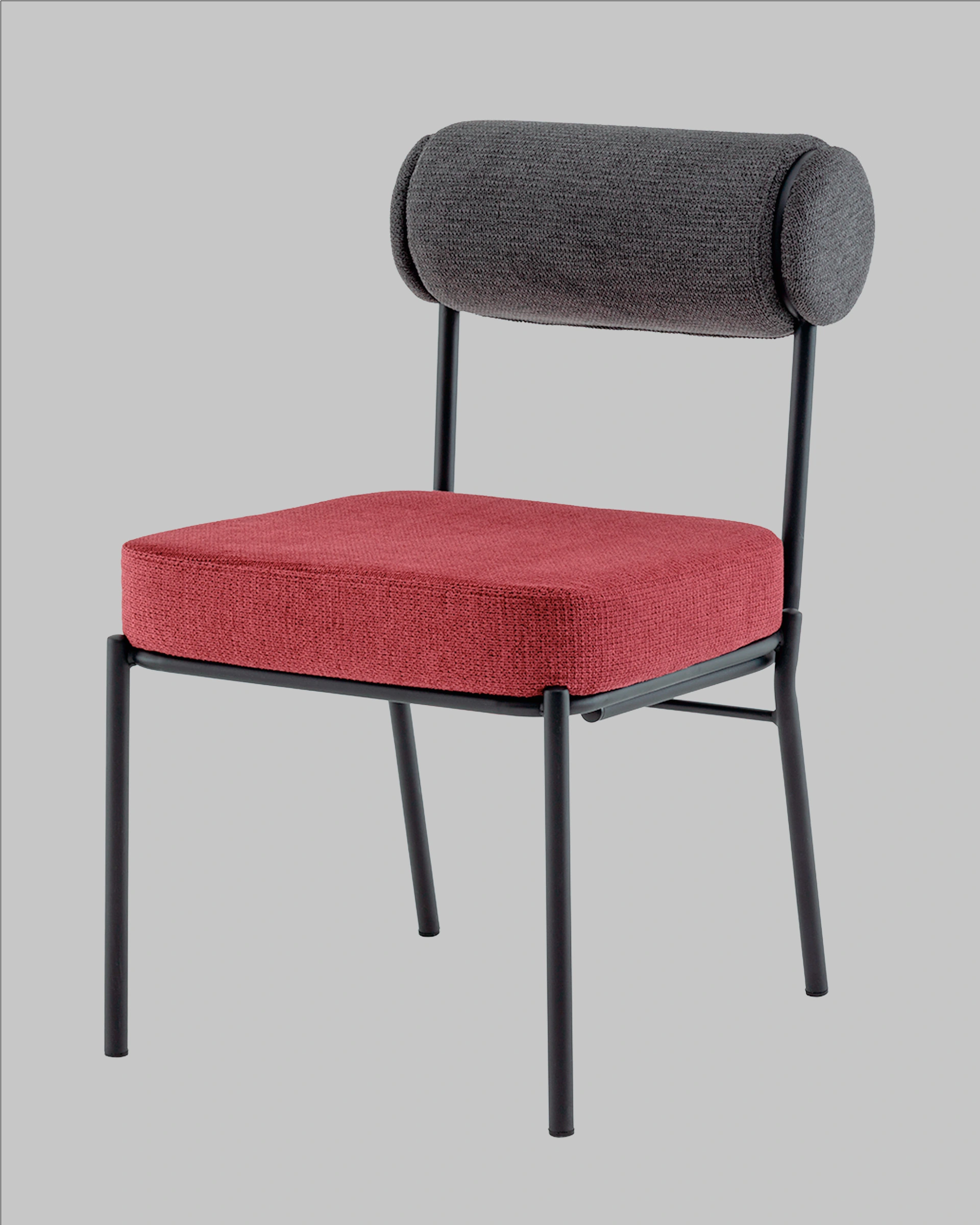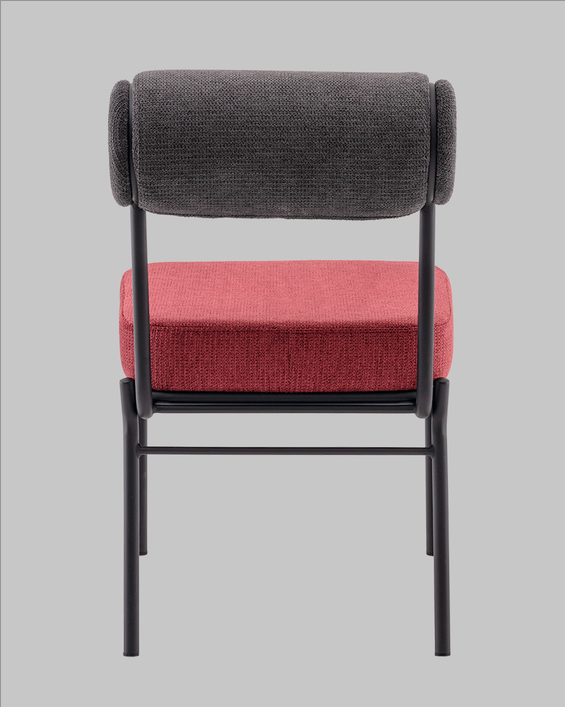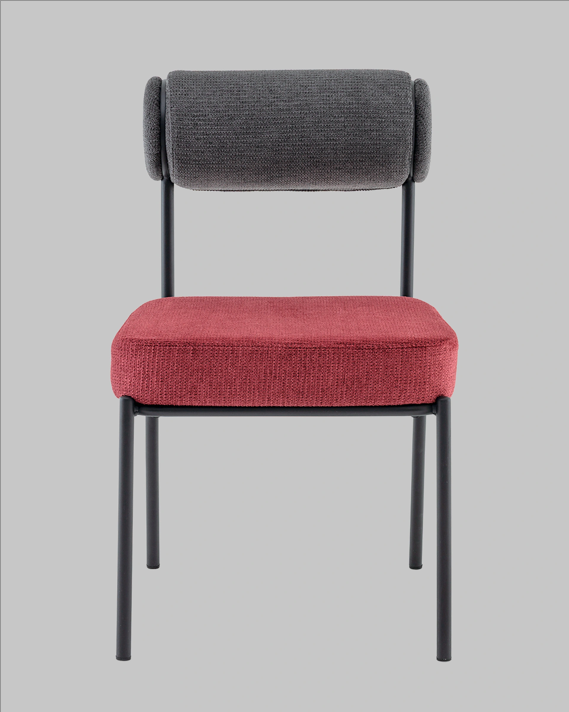 Стул выполнен из приятного на ощупь шенилла в оригинальных оттенках: сиденье – насыщенного цвета бордо, а спинка в темно-сером тоне. Черный металлический каркас обеспечивает прочность и долговечность, создавая гармоничный контраст с мягкой текстильной обивкой.