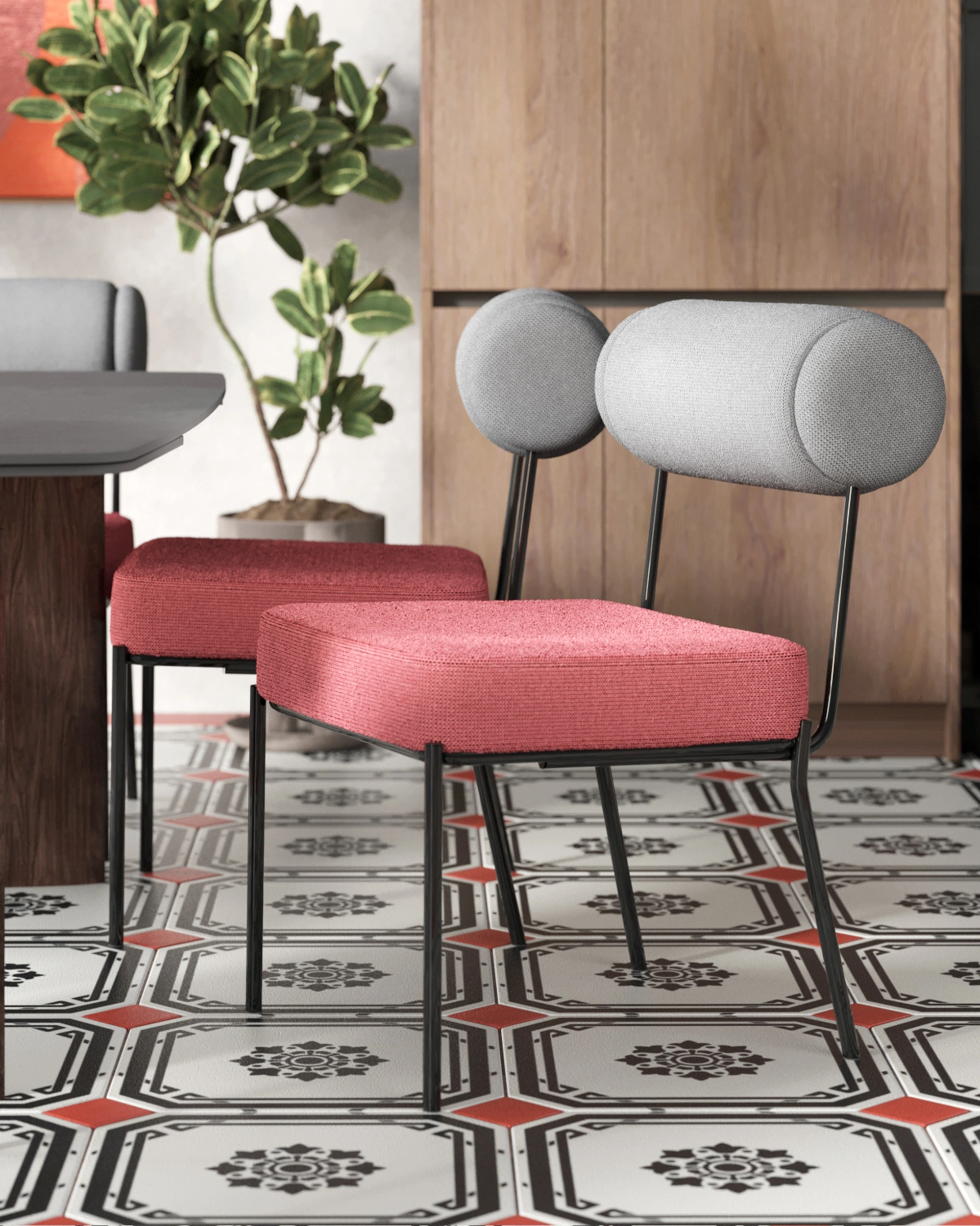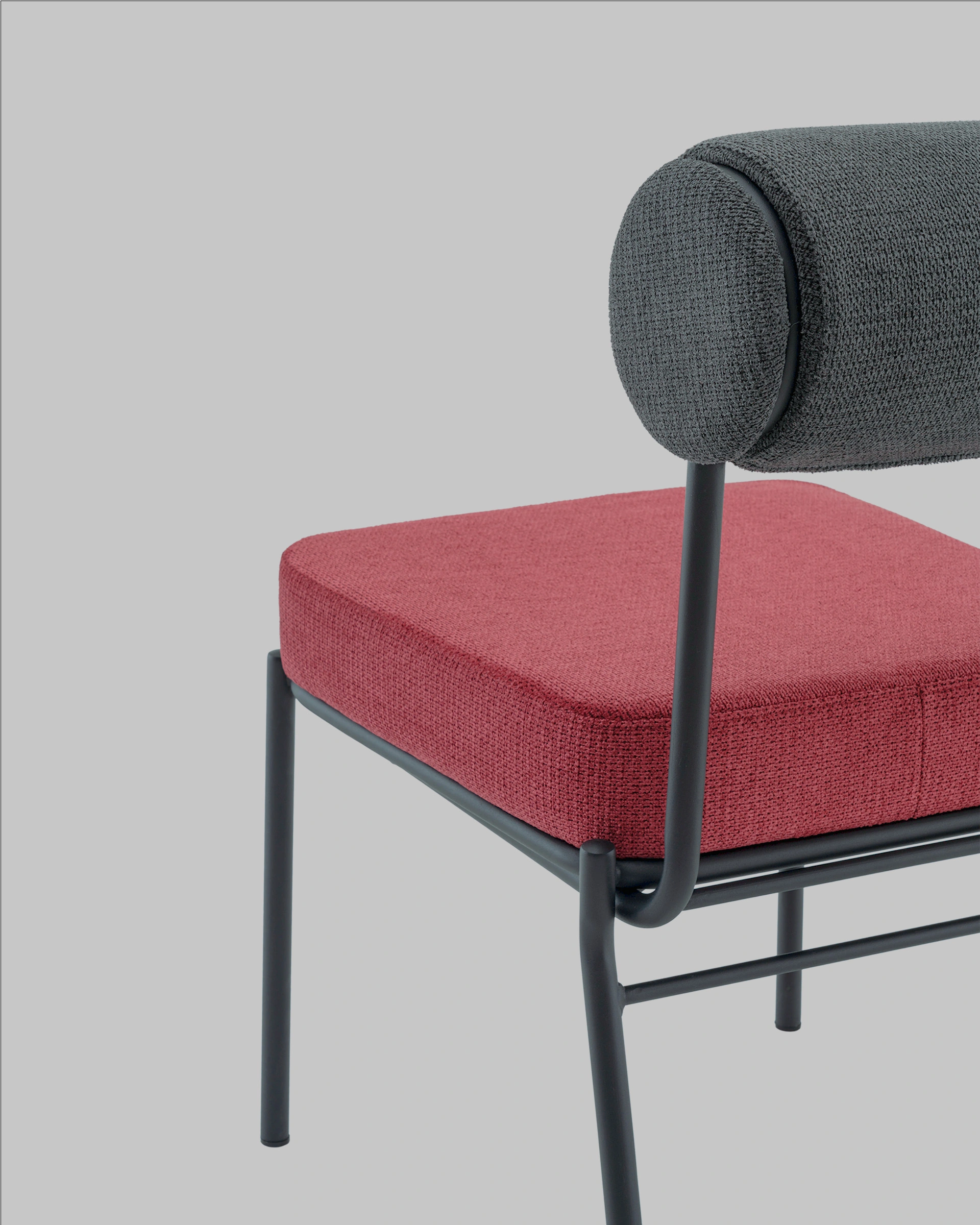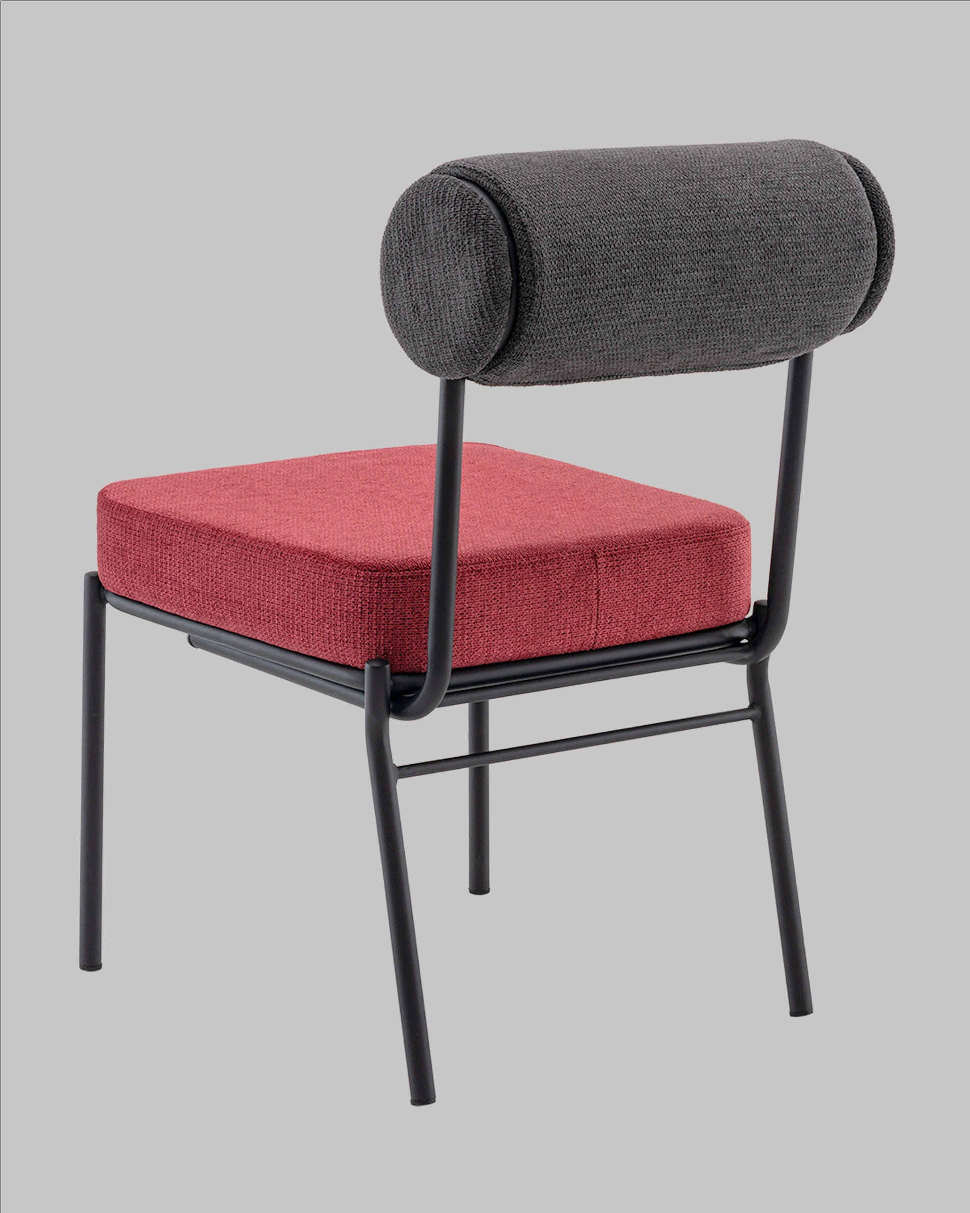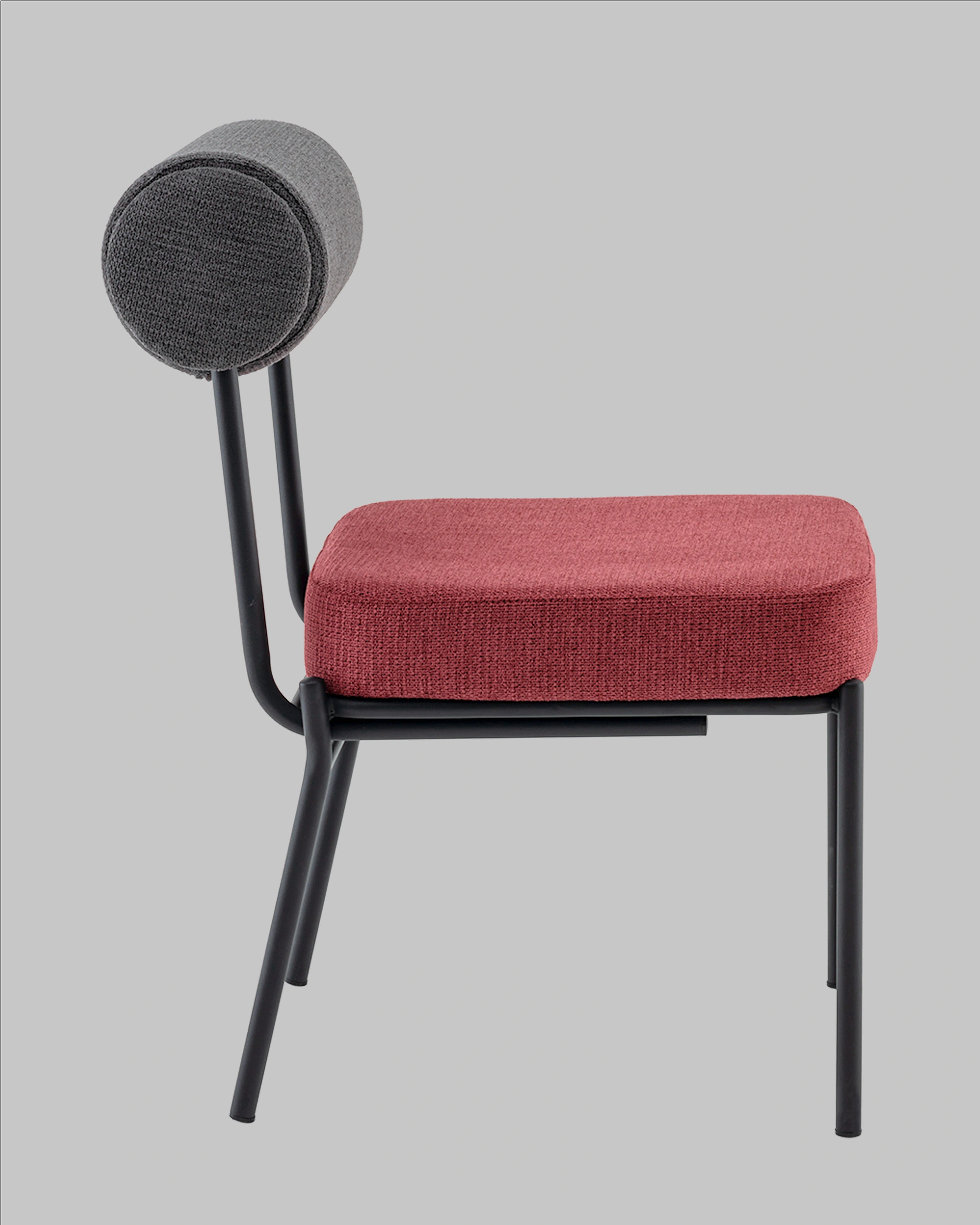 Стул выполнен из приятного на ощупь шенилла в оригинальных оттенках: сиденье – насыщенного цвета бордо, а спинка в темно-сером тоне. Черный металлический каркас обеспечивает прочность и долговечность, создавая гармоничный контраст с мягкой текстильной обивкой.