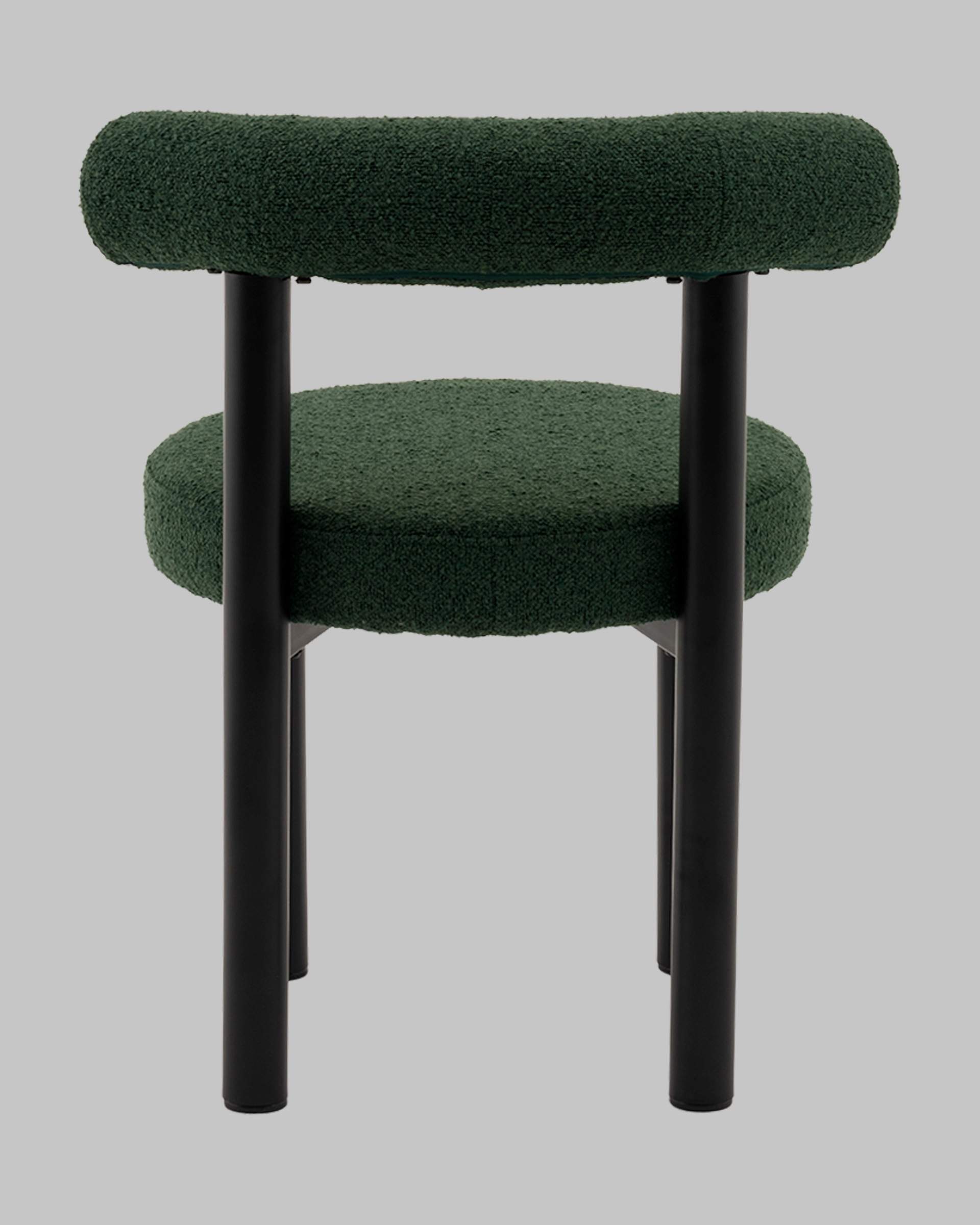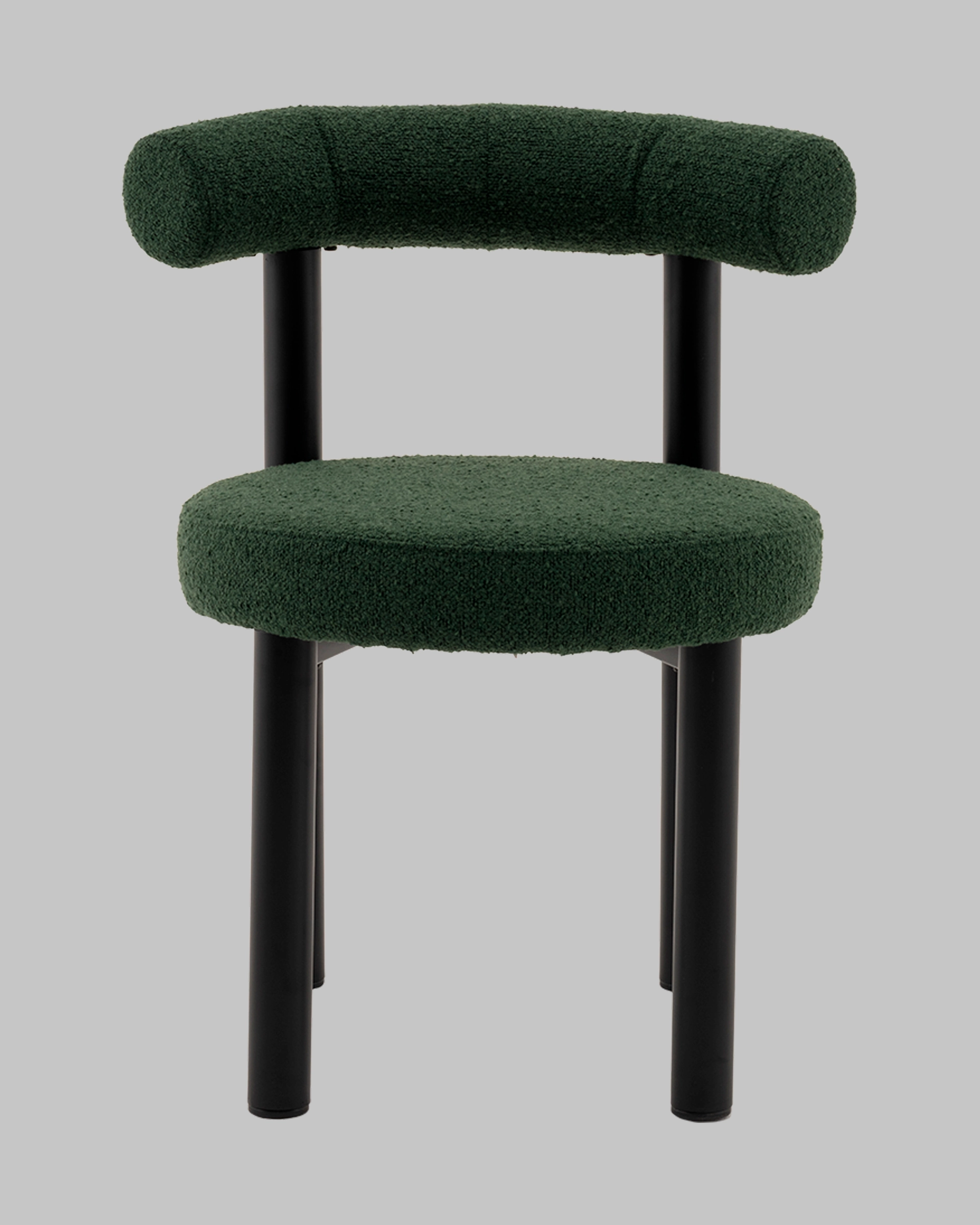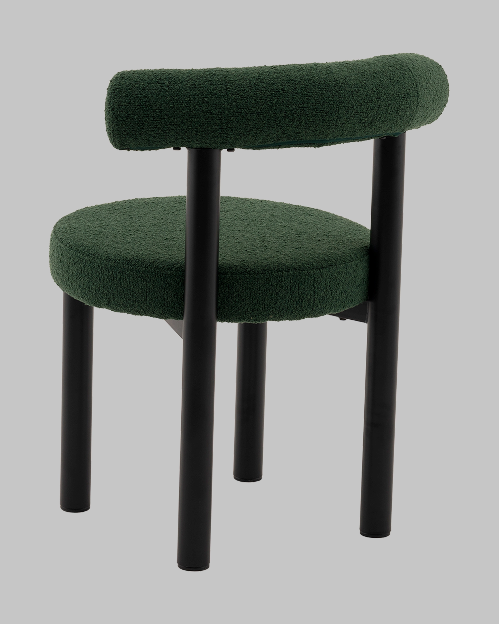 Материалы и цвета.Стул выполнен из высококачественного букле в зеленом цвете, который приятно ощущается на ощупь. Черный металлический каркас и ножки создают стильный контраст с мягкой обивкой, подчеркивая современный и минималистичный стиль. Комбинация этих материалов обеспечивает долговечность и привлекательный внешний вид.