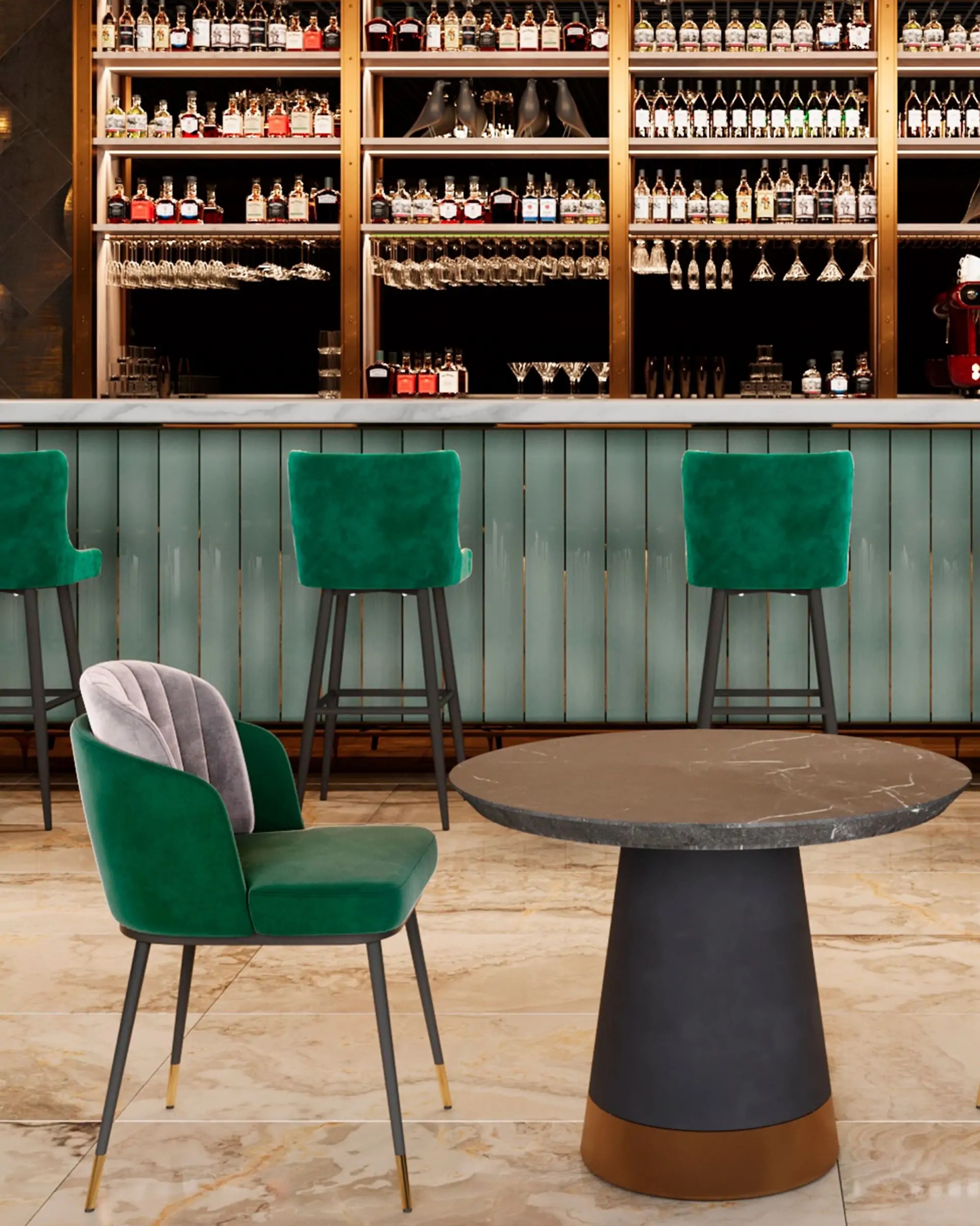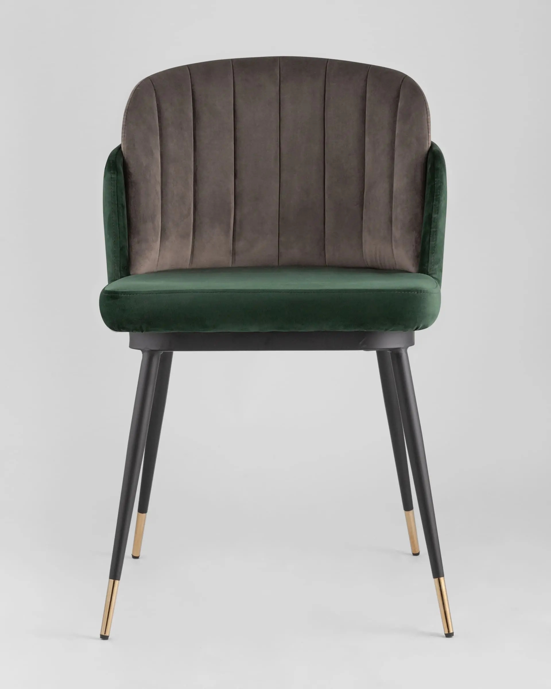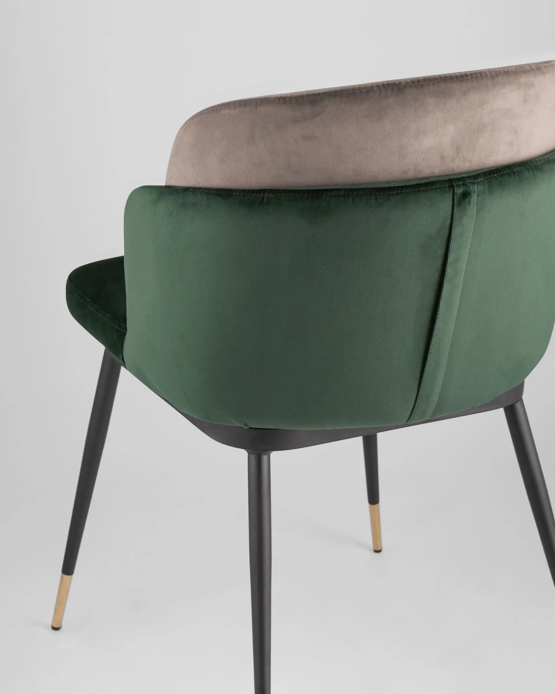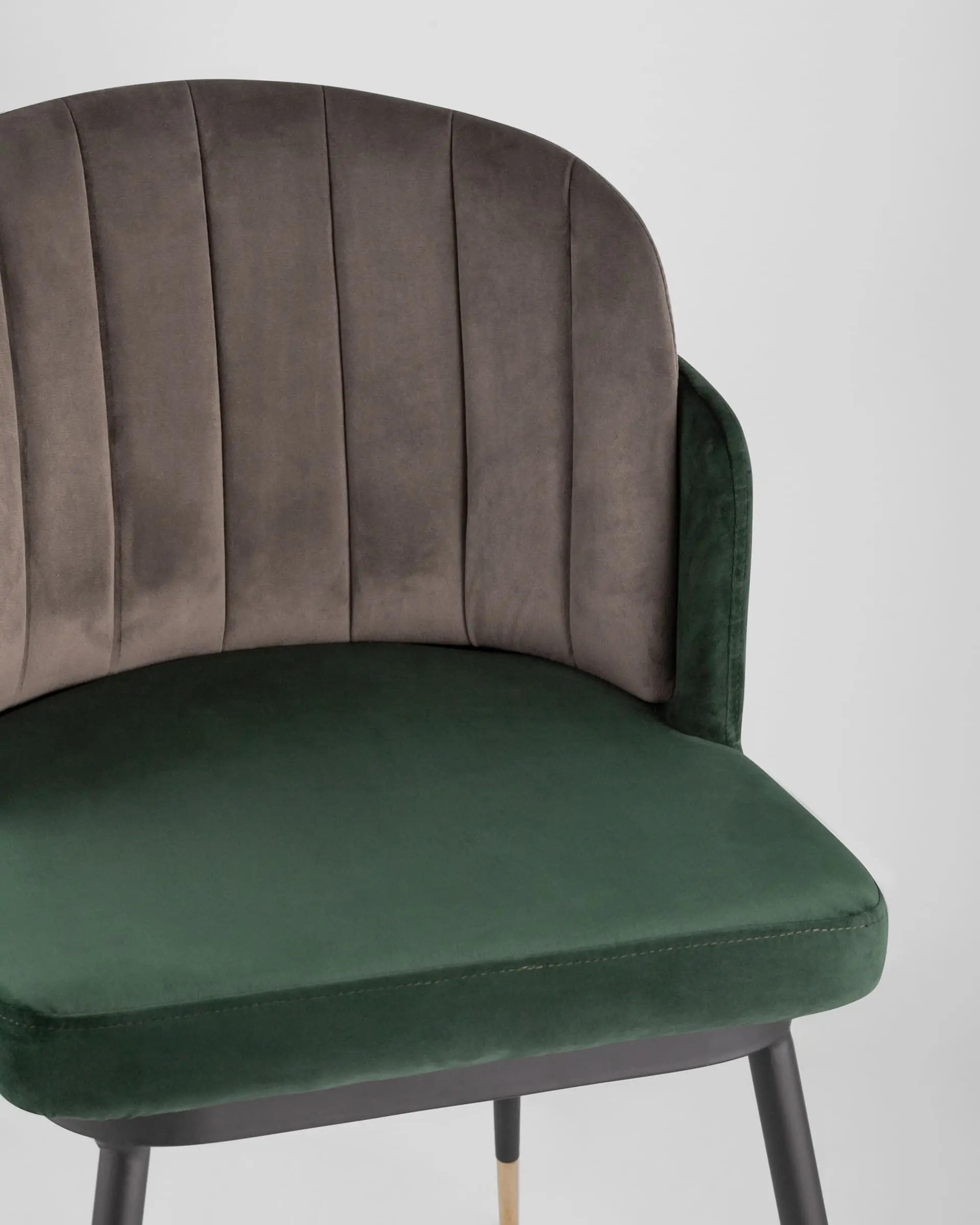Комплект из четырех стульев. Мягкий двухцветный кухонный стул с обивкой из велюра. Надежная опора достигается благодаря металлическому каркасу и удобным устойчивым ножкам, красиво украшенным золотом. Спинка состоит из двух элементов, внутренняя часть с вертикальной строчкой.