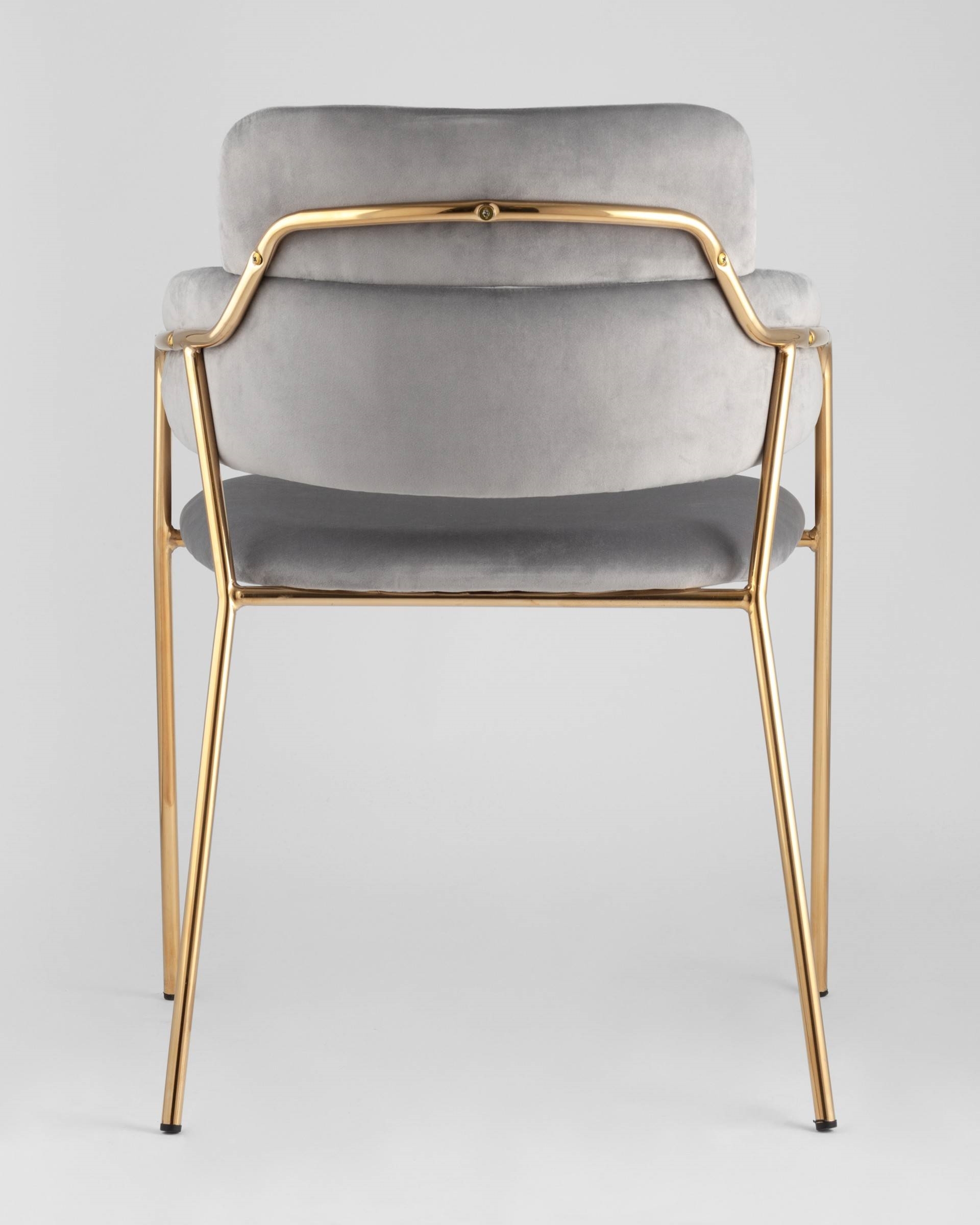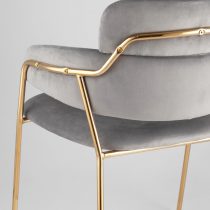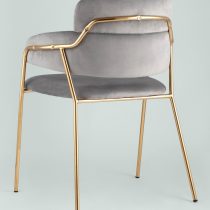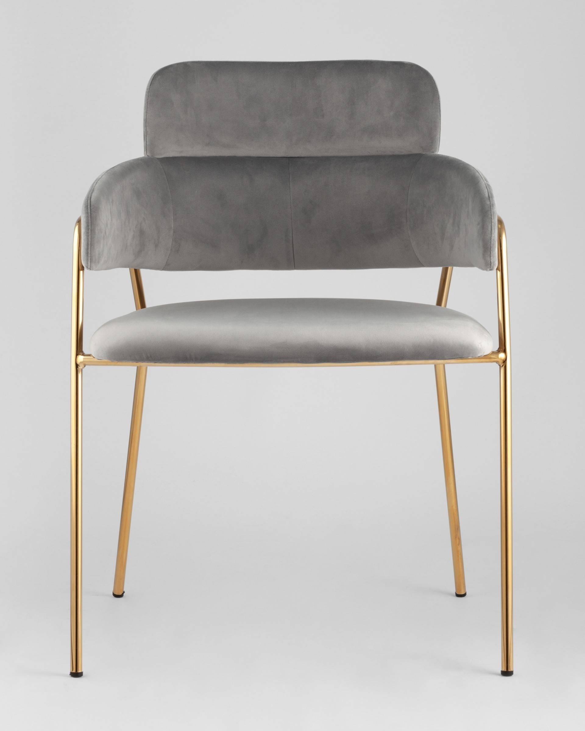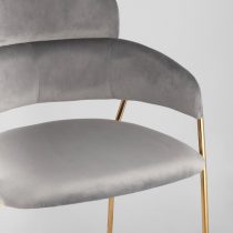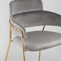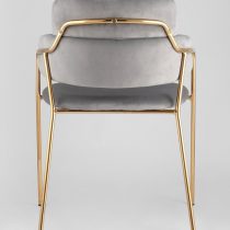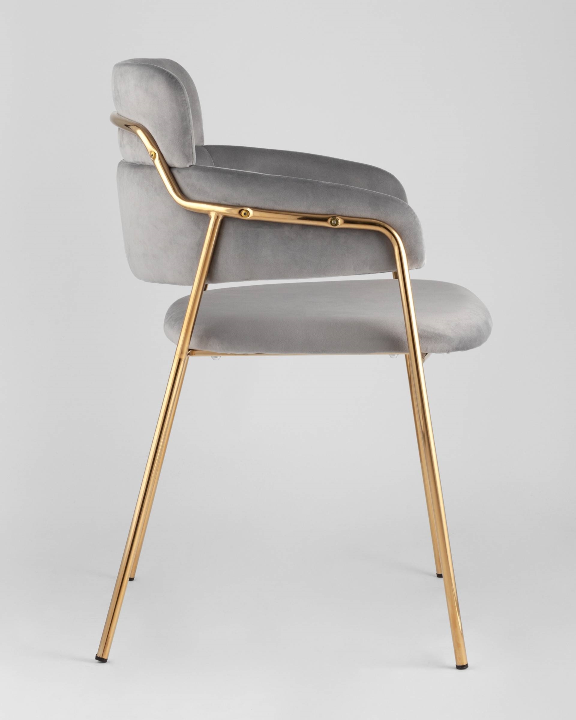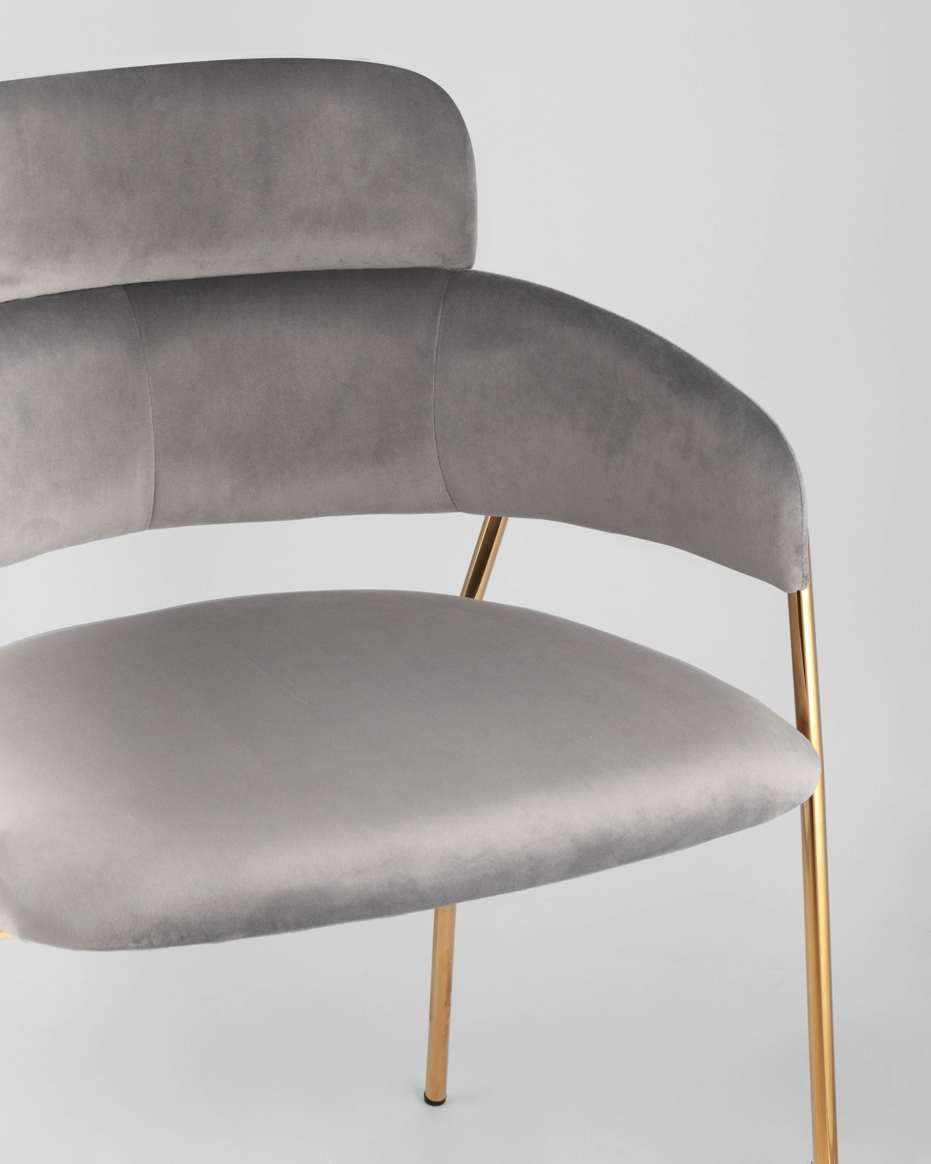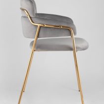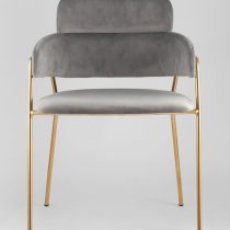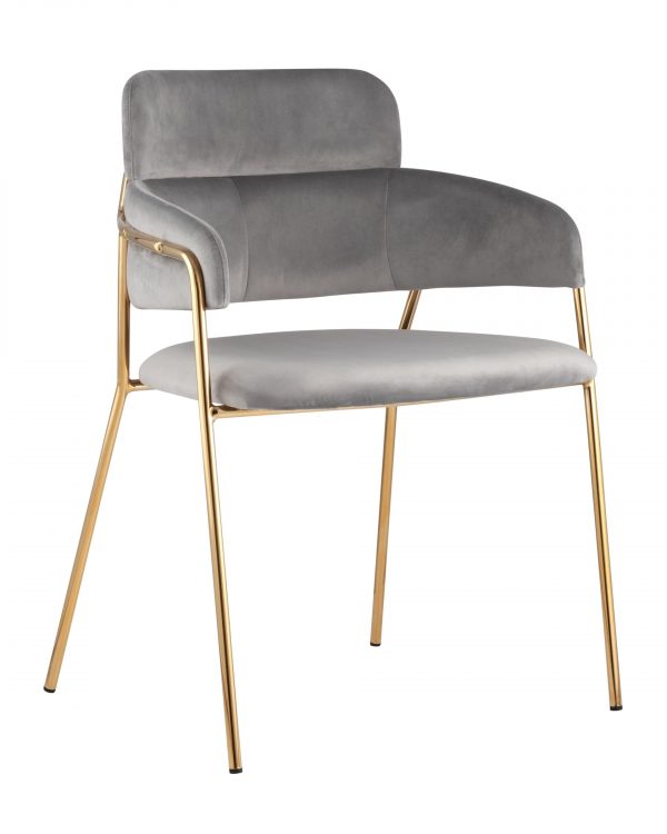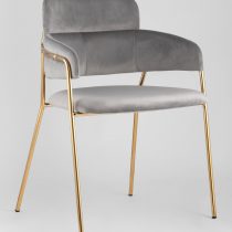 Стильный стул с оригинальной формой спинки, высокой поддержкой и подлокотниками. В качестве обивки используется мягкий велюр. Металлический каркас золотого цвета огибает спинку и выступает аккуратным акцентом модели. Широкое сиденье обеспечивает удобную посадку и уют.