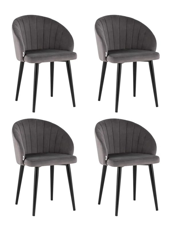Комплект из четырех стульев. Обеденный стул Брюссель с мягкой полукруглой спинкой и сидением из нежного велюра отлично впишется в обеденную зону любой современной кухни. Внутренняя сторона спинки декорирована вертикальными прямыми строчками. Каркас металлический, ножки выполнены в черном цвете. Дополнительно предусмотрены специальные подпятники, которые предотвращают скольжение и повреждение напольного покрытия. Прекрасно сочетается с обеденным или письменным столом.