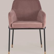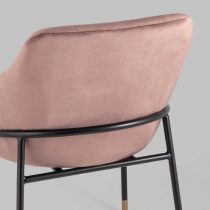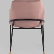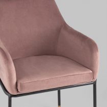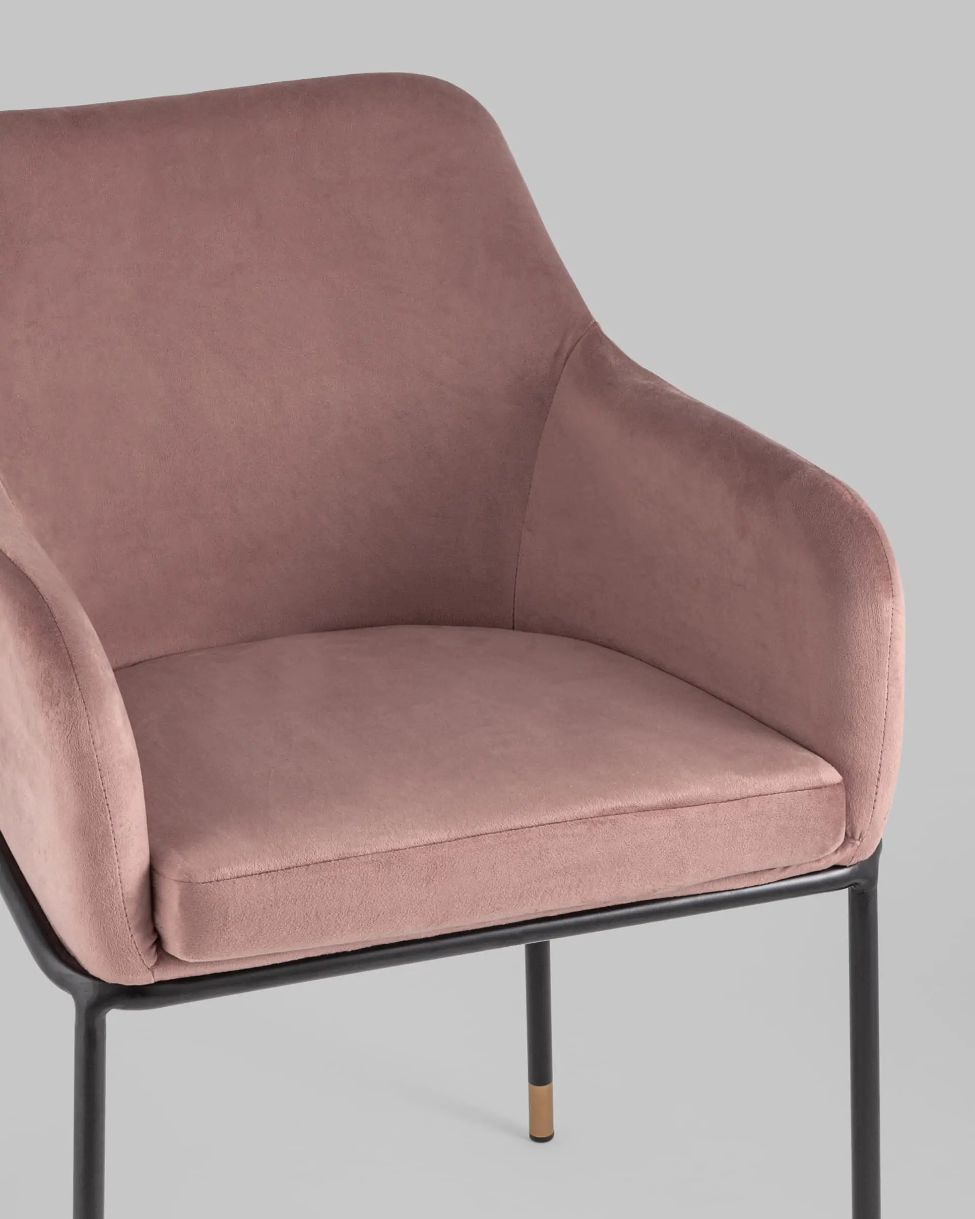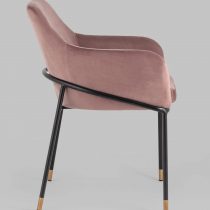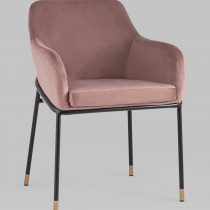 Стул с эргономичной посадкой, мягким сиденьем и широкой удобной спинкой и мягкими подлокотниками. Каркас и ножки черного матового цвета изготовлены из прочного металла с золотым декором, обивка из велюра – износостойкого материала с приятной на ощупь структурой.