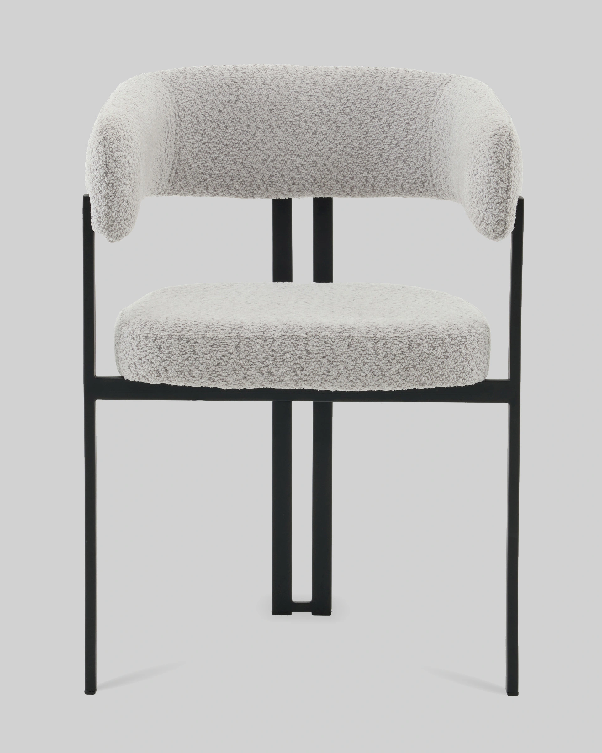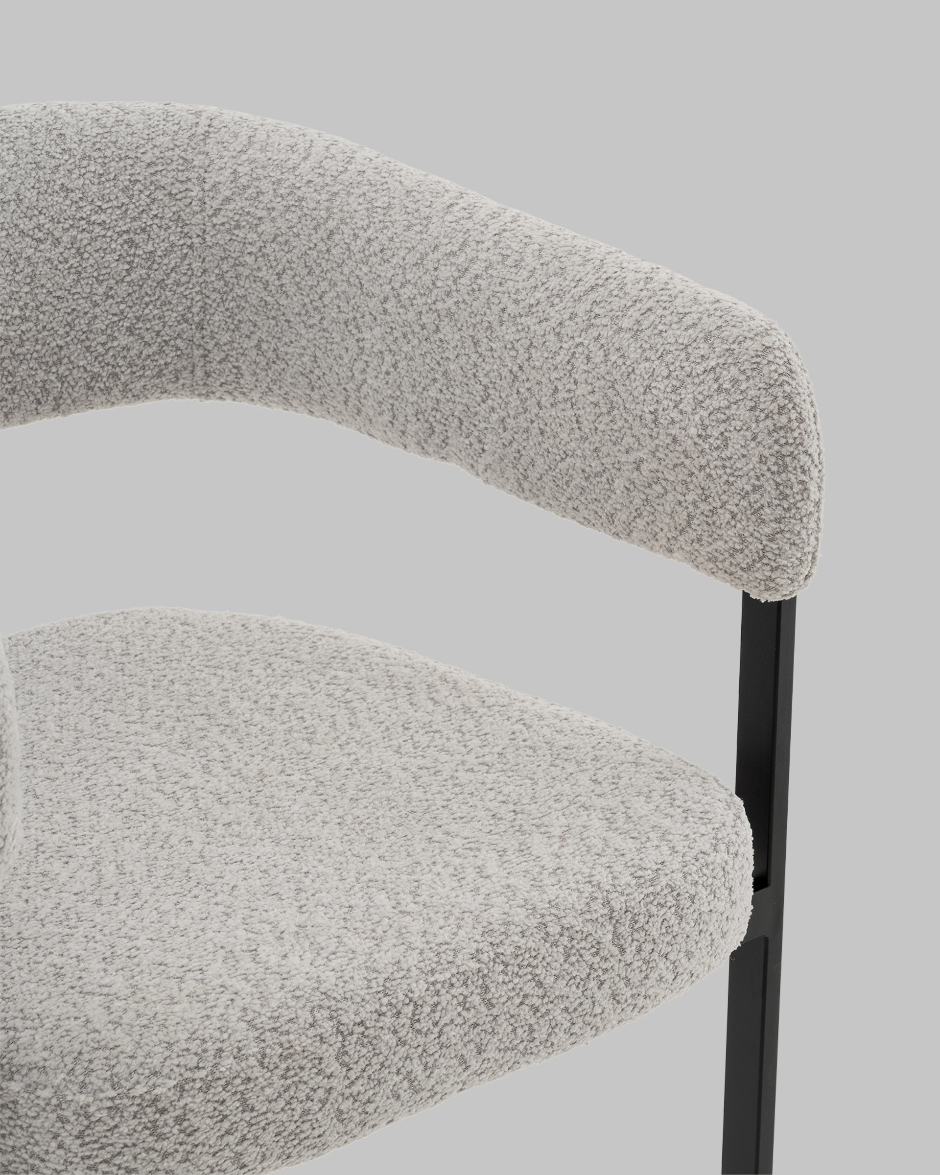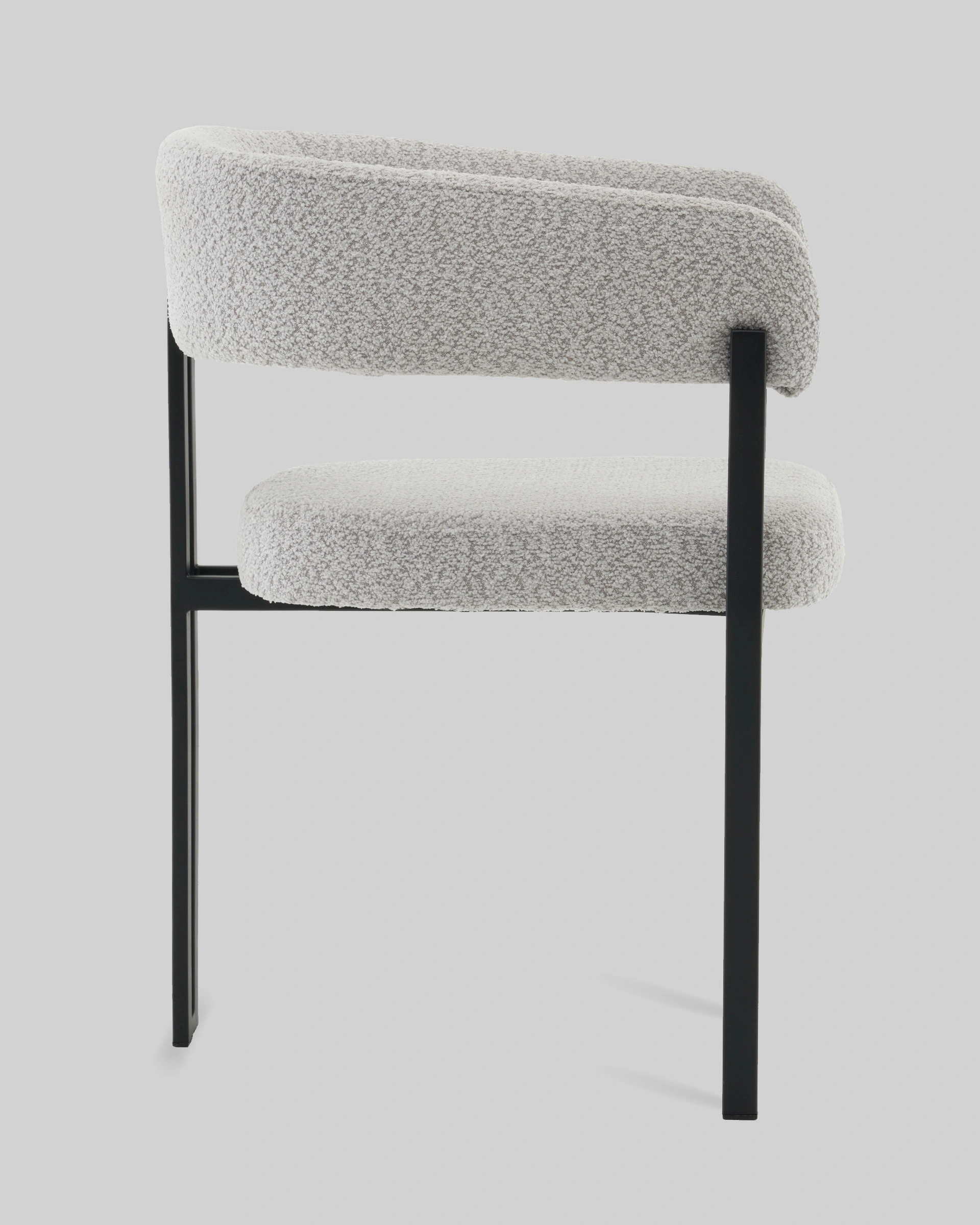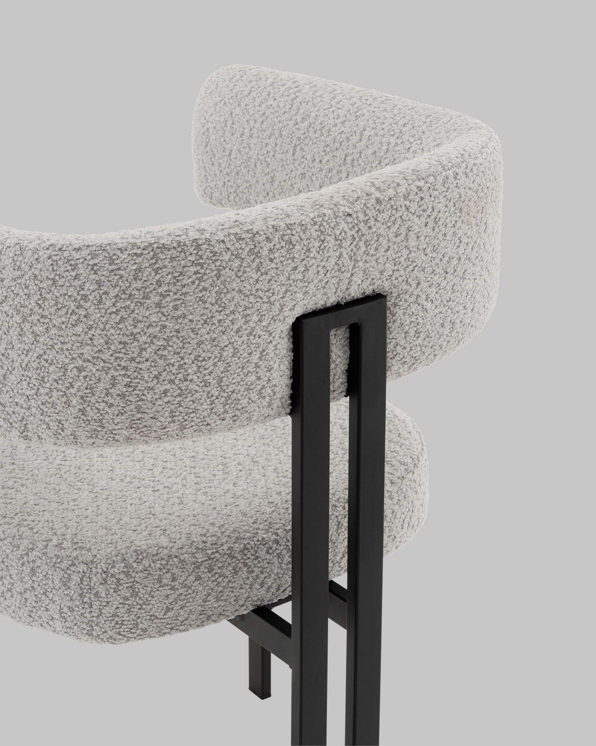 Стул для кухниСеренидат сочетает строгие линии и мягкий комфорт. Обивка из светло-серого букле придаёт изделию тактильную теплоту и современный облик, делая его стильным акцентом в интерьере. Чёрный металлический каркас подчёркивает геометрию силуэта и добавляет выразительности, создавая гармоничный контраст.