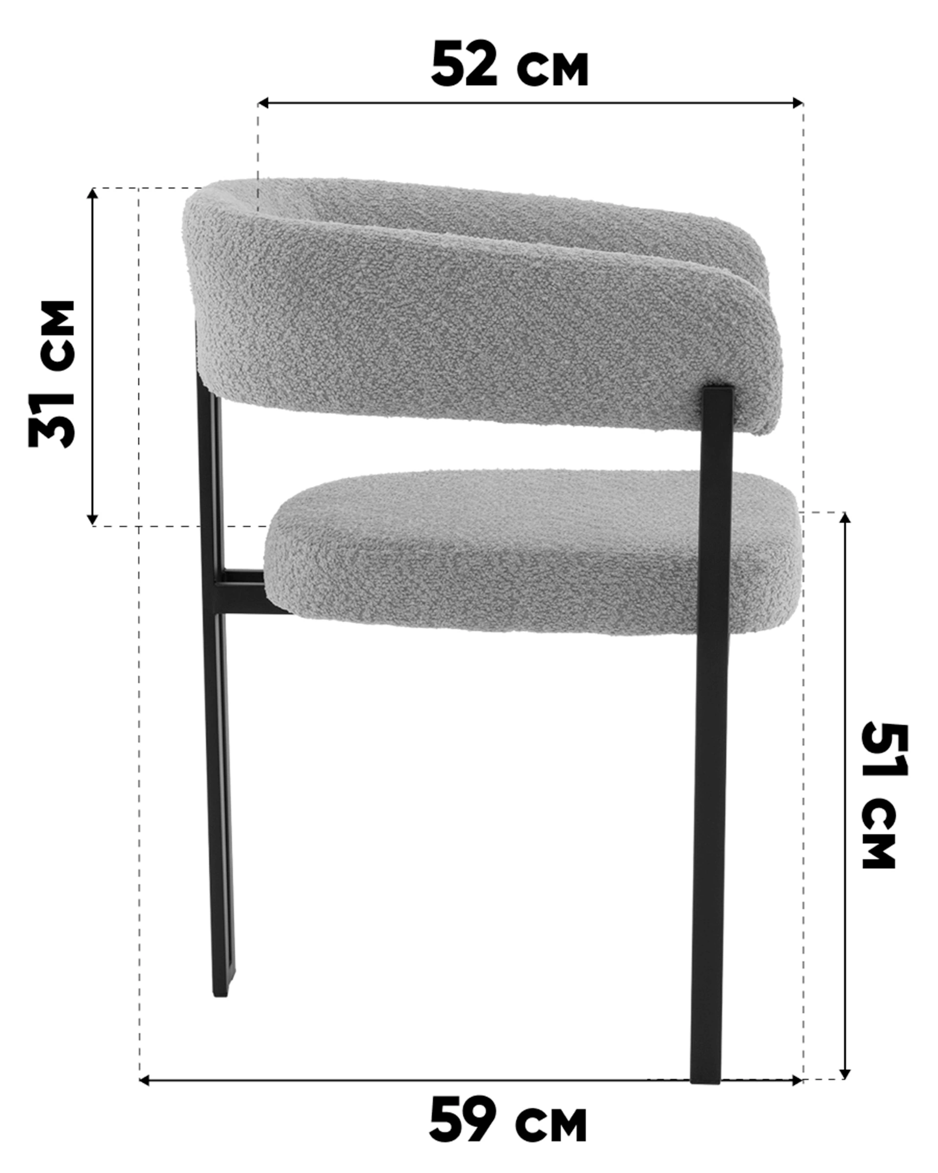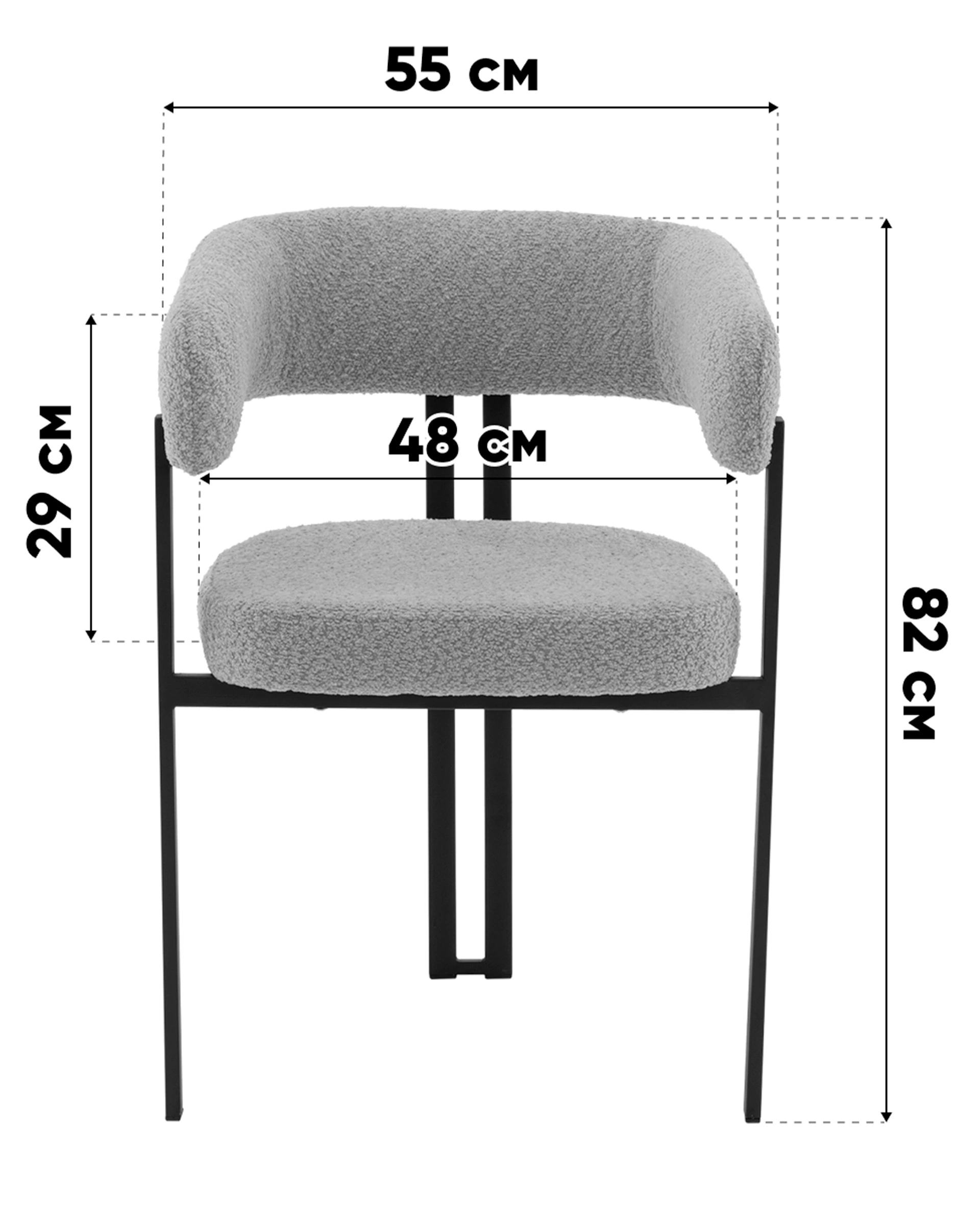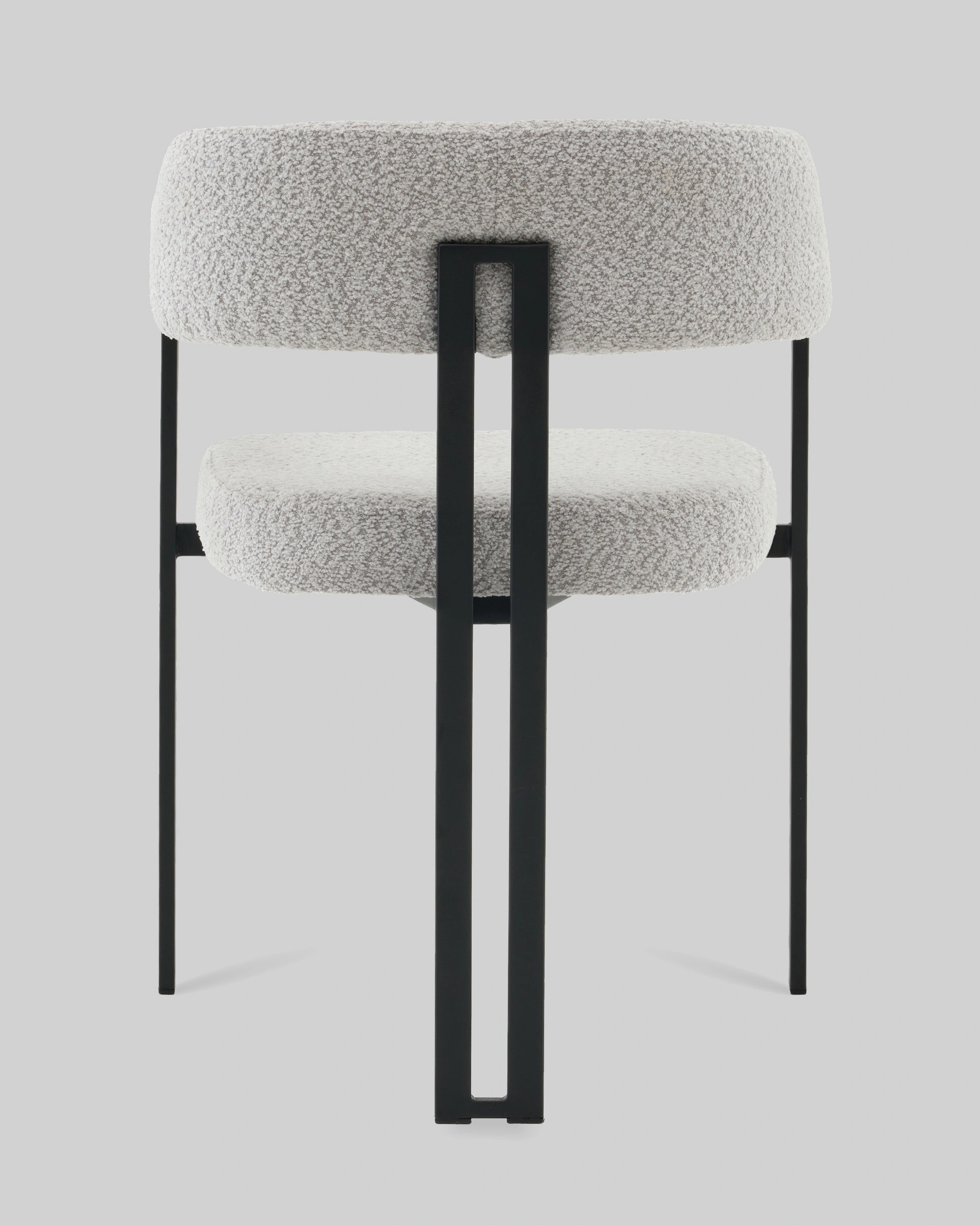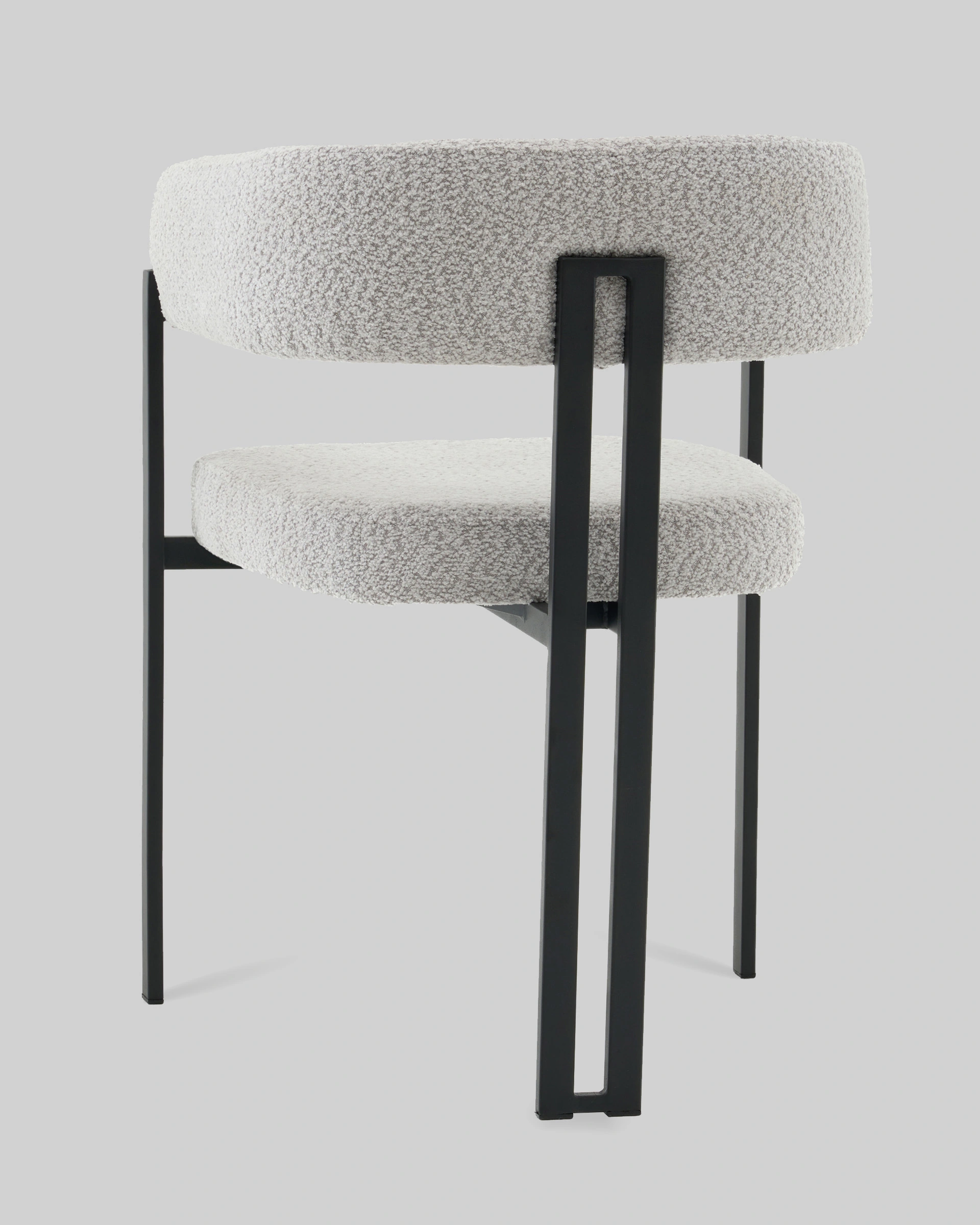 Стул для кухниСеренидат сочетает строгие линии и мягкий комфорт. Обивка из светло-серого букле придаёт изделию тактильную теплоту и современный облик, делая его стильным акцентом в интерьере. Чёрный металлический каркас подчёркивает геометрию силуэта и добавляет выразительности, создавая гармоничный контраст.