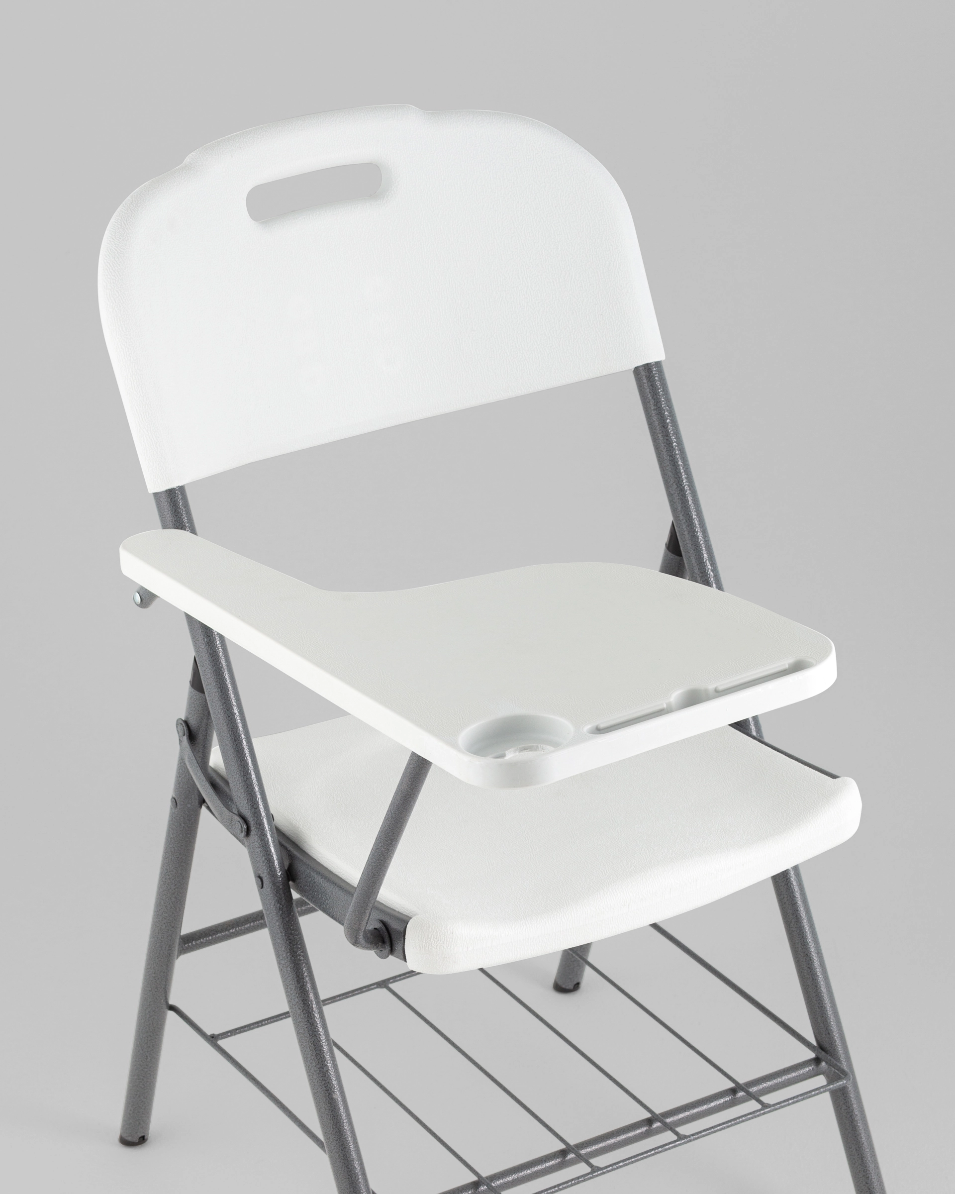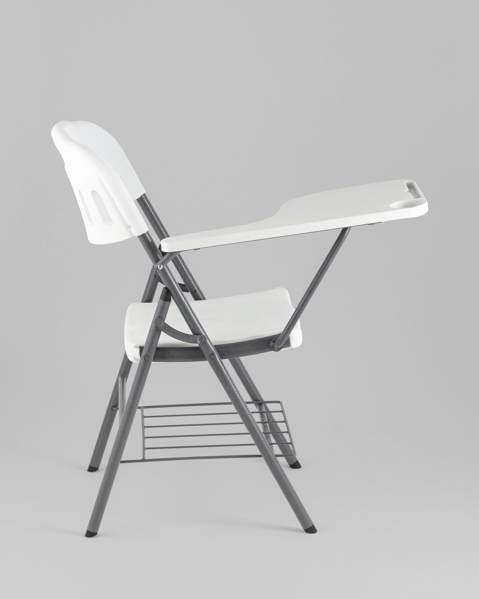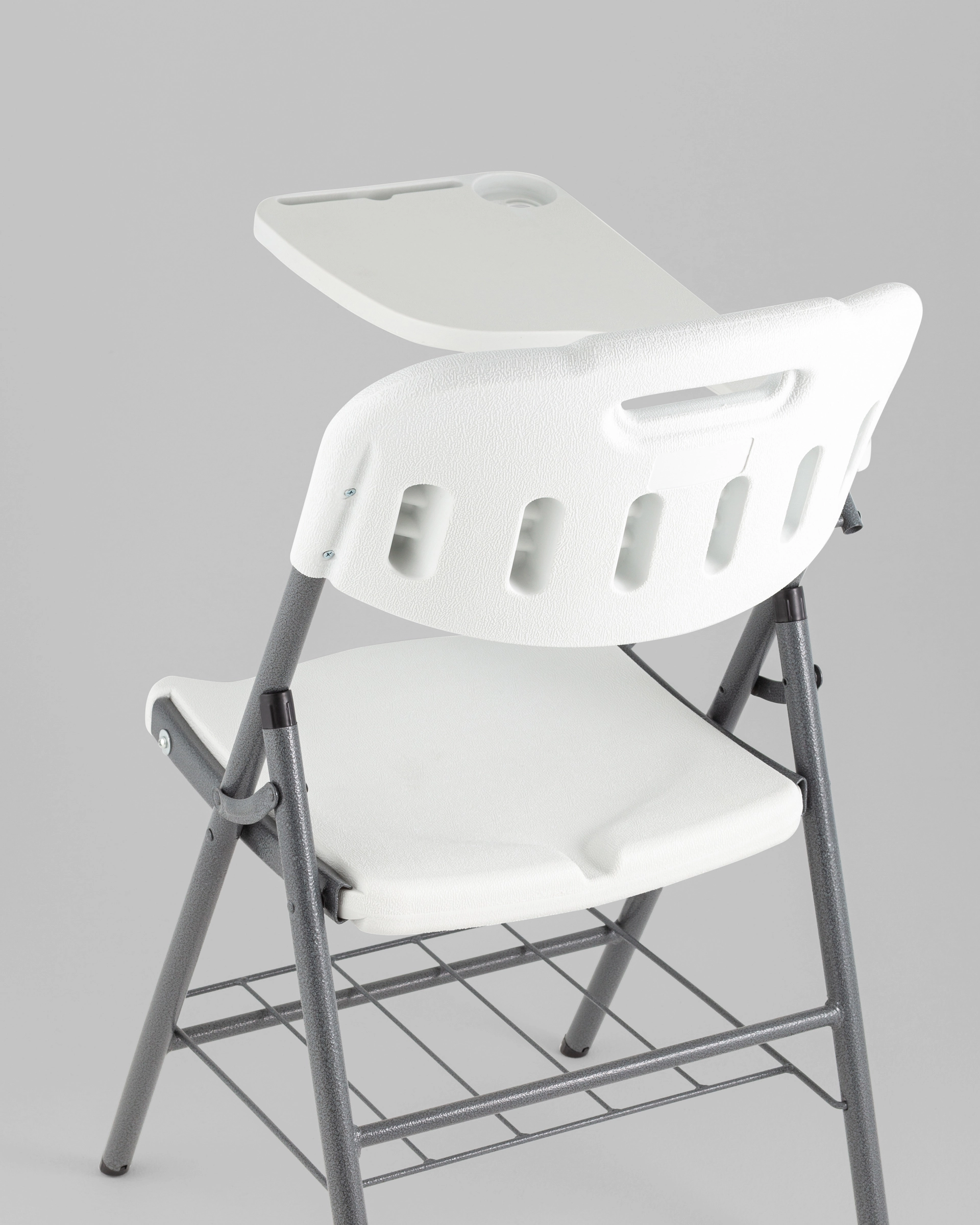 Дизайн и комфорт.Стул имеет современный стиль и лаконичный белый цвет, что делает его универсальным для любого интерьера. Ножки с серебристым покрытием создают легкий контраст с сиденьем. Модель обладает широкой спинкой и удобной посадкой, что гарантирует комфорт даже при длительном сидении. Особенностью данной модели является наличие складного столика, который можно использовать как для работы, так и для приема пищи. Столик закреплен с правой стороны стула и легко раскладывается при необходимости, что делает его идеальным для мероприятий, где требуется дополнительная поверхность. Полка под сиденьем предоставляет удобное место для хранения вещей, добавляя дополнительную функциональность.