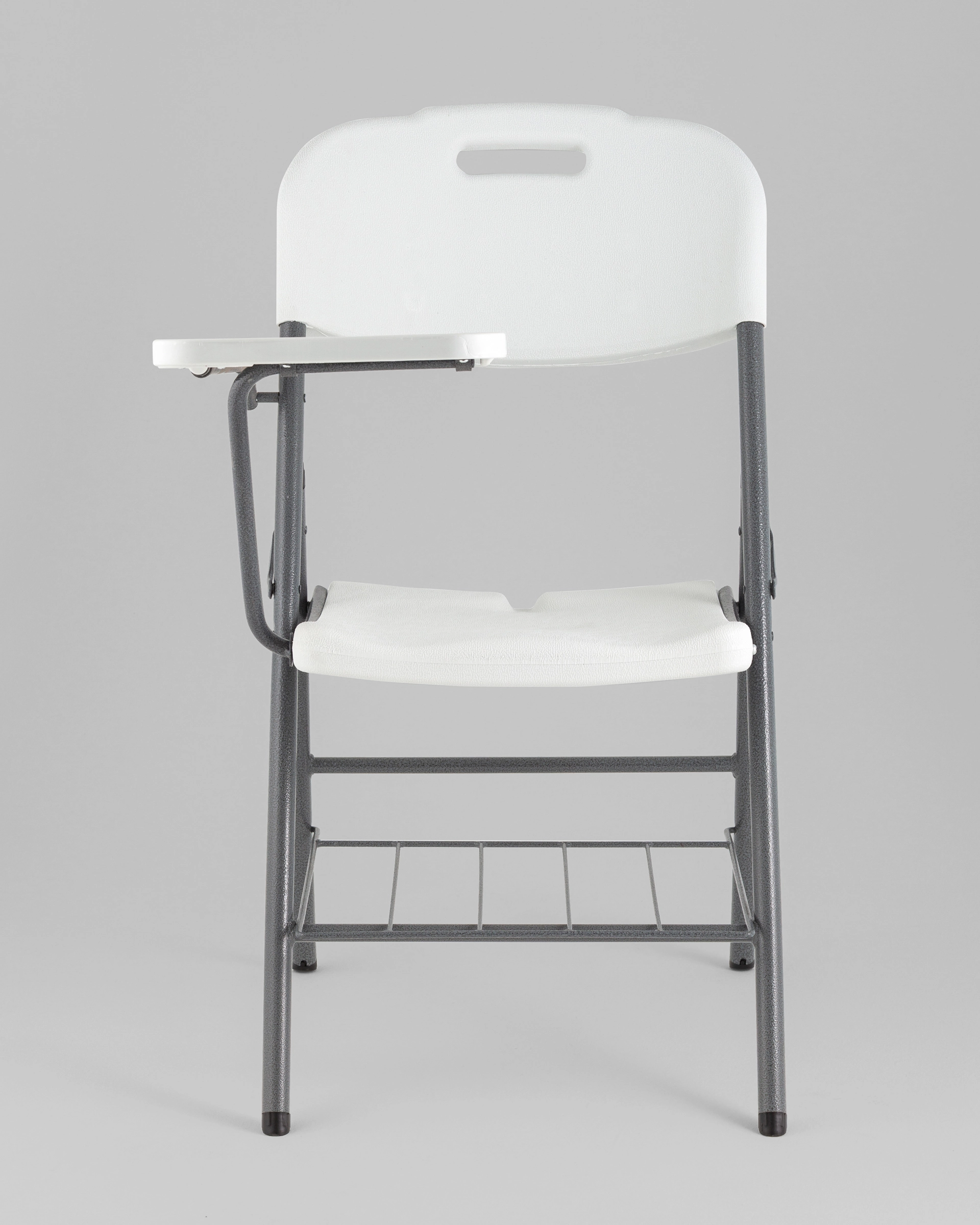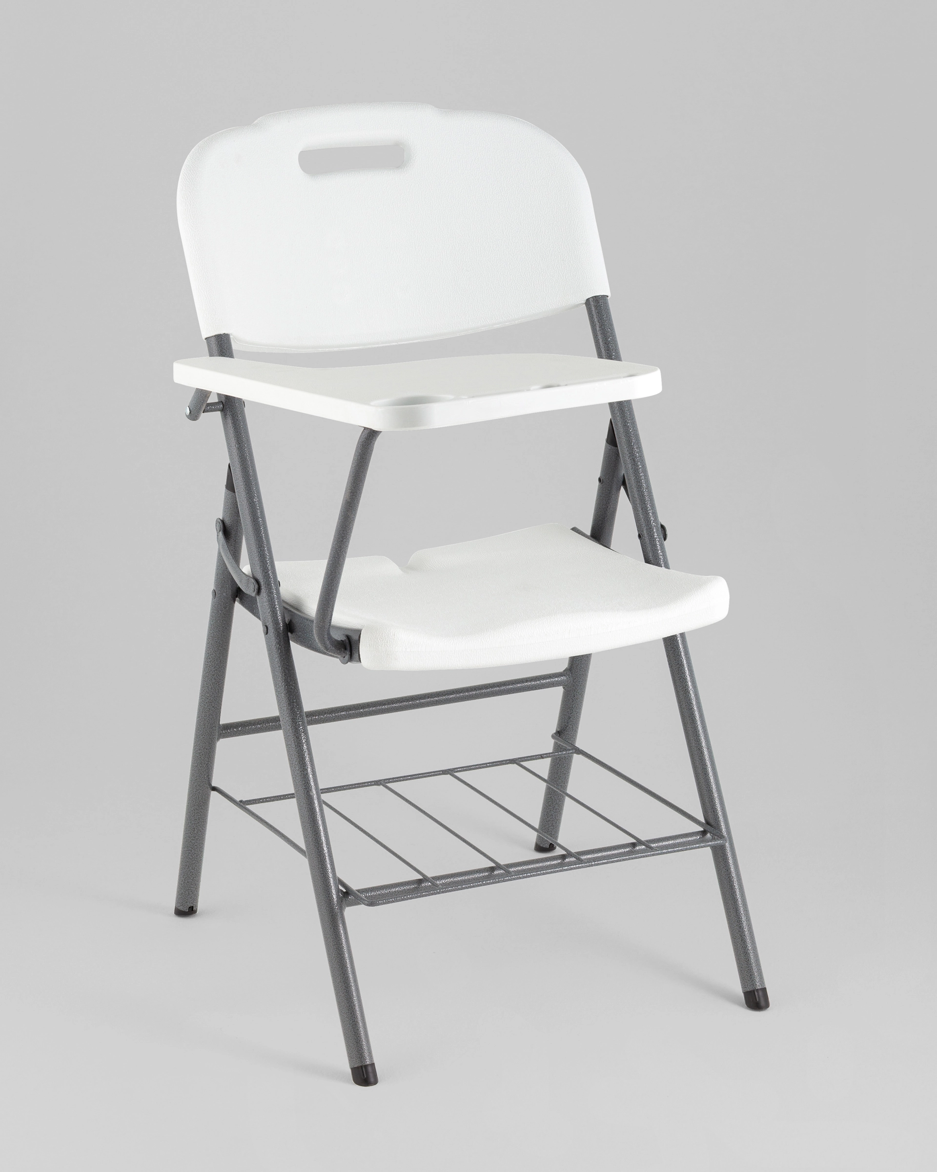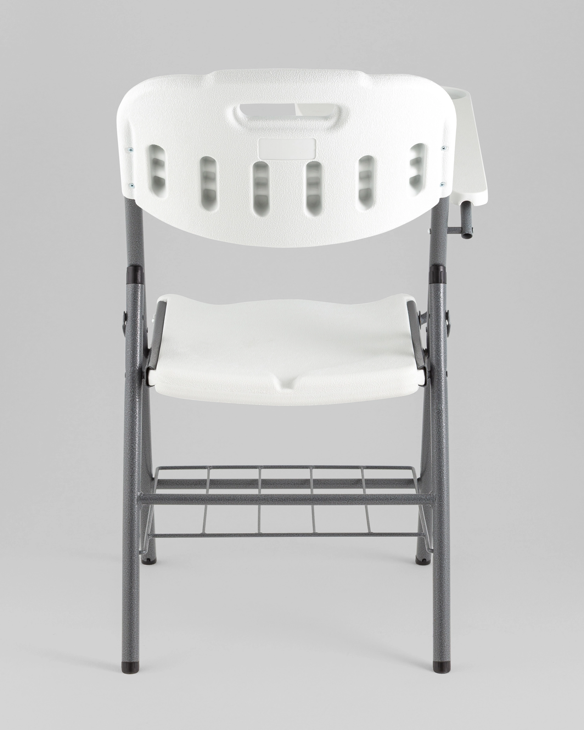 Дизайн и комфорт.Стул имеет современный стиль и лаконичный белый цвет, что делает его универсальным для любого интерьера. Ножки с серебристым покрытием создают легкий контраст с сиденьем. Модель обладает широкой спинкой и удобной посадкой, что гарантирует комфорт даже при длительном сидении. Особенностью данной модели является наличие складного столика, который можно использовать как для работы, так и для приема пищи. Столик закреплен с правой стороны стула и легко раскладывается при необходимости, что делает его идеальным для мероприятий, где требуется дополнительная поверхность. Полка под сиденьем предоставляет удобное место для хранения вещей, добавляя дополнительную функциональность.