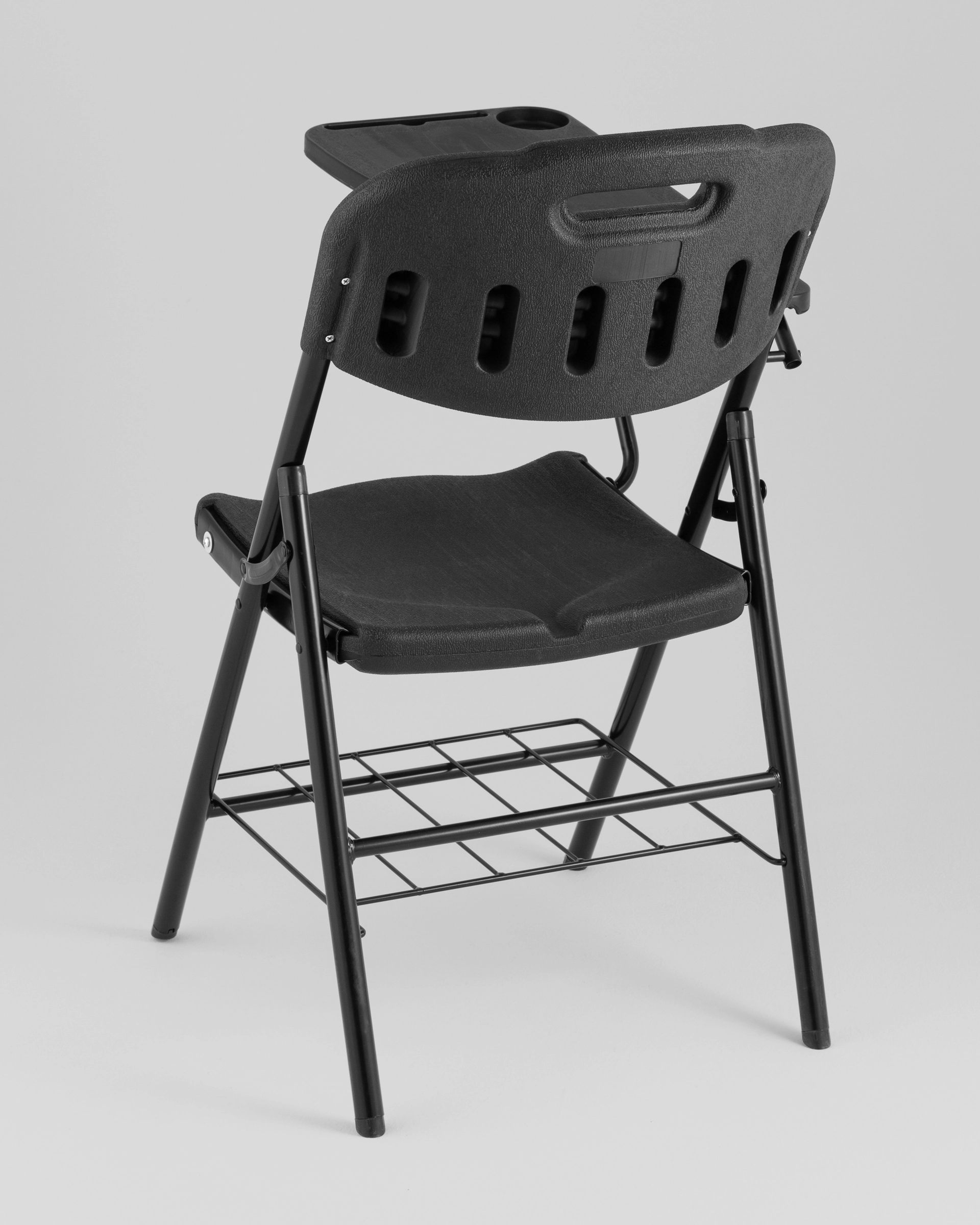 Дизайн и комфорт.Стул имеет современный стиль и лаконичный черный цвет, что делает его универсальным для любого интерьера. Модель обладает широкой спинкой и удобной посадкой, что гарантирует комфорт даже при длительном сидении. Особенностью данной модели является наличие складного столика, который можно использовать как для работы, так и для приема пищи. Столик закреплен с правой стороны стула и легко раскладывается при необходимости, что делает его идеальным для мероприятий, где требуется дополнительная поверхность. Полка под сиденьем предоставляет удобное место для хранения вещей, добавляя дополнительную функциональность.