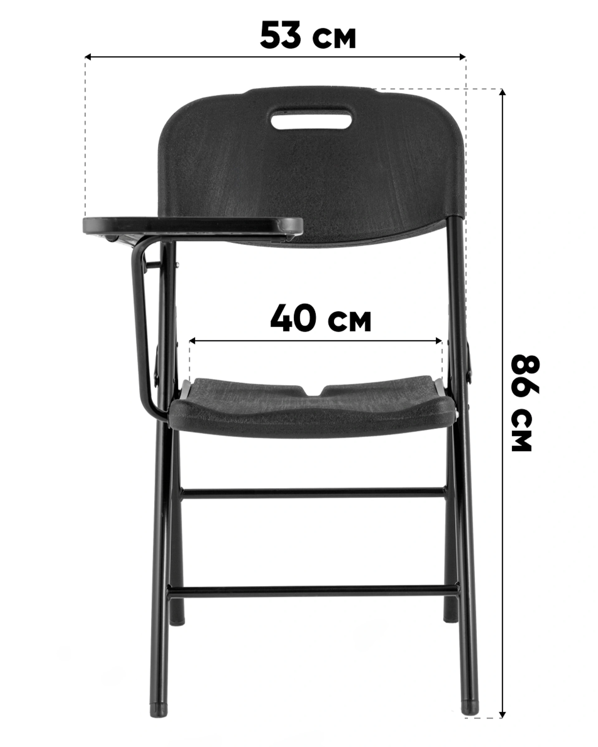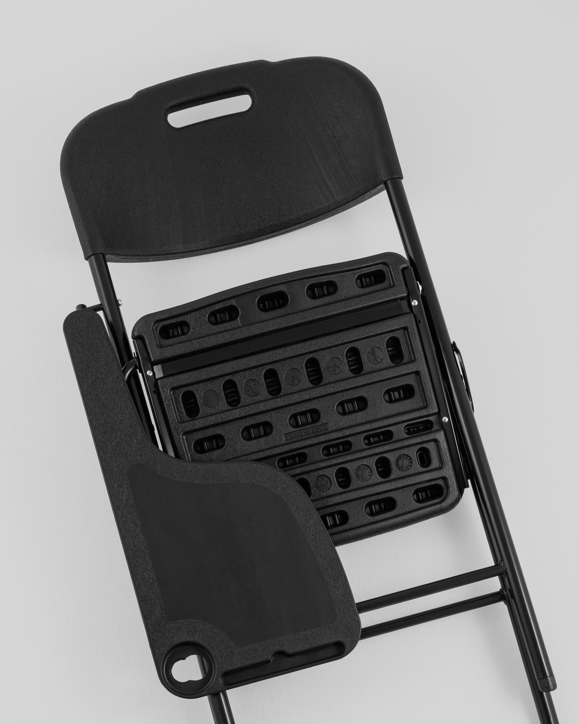 Дизайн и комфорт.Стул имеет современный стиль и лаконичный черный цвет, что делает его универсальным для любого интерьера. Модель обладает широкой спинкой и удобной посадкой, что гарантирует комфорт даже при длительном сидении. Особенностью данной модели является наличие складного столика, который можно использовать как для работы, так и для приема пищи. Столик закреплен с правой стороны стула и легко раскладывается при необходимости, что делает его идеальным для мероприятий, где требуется дополнительная поверхность.