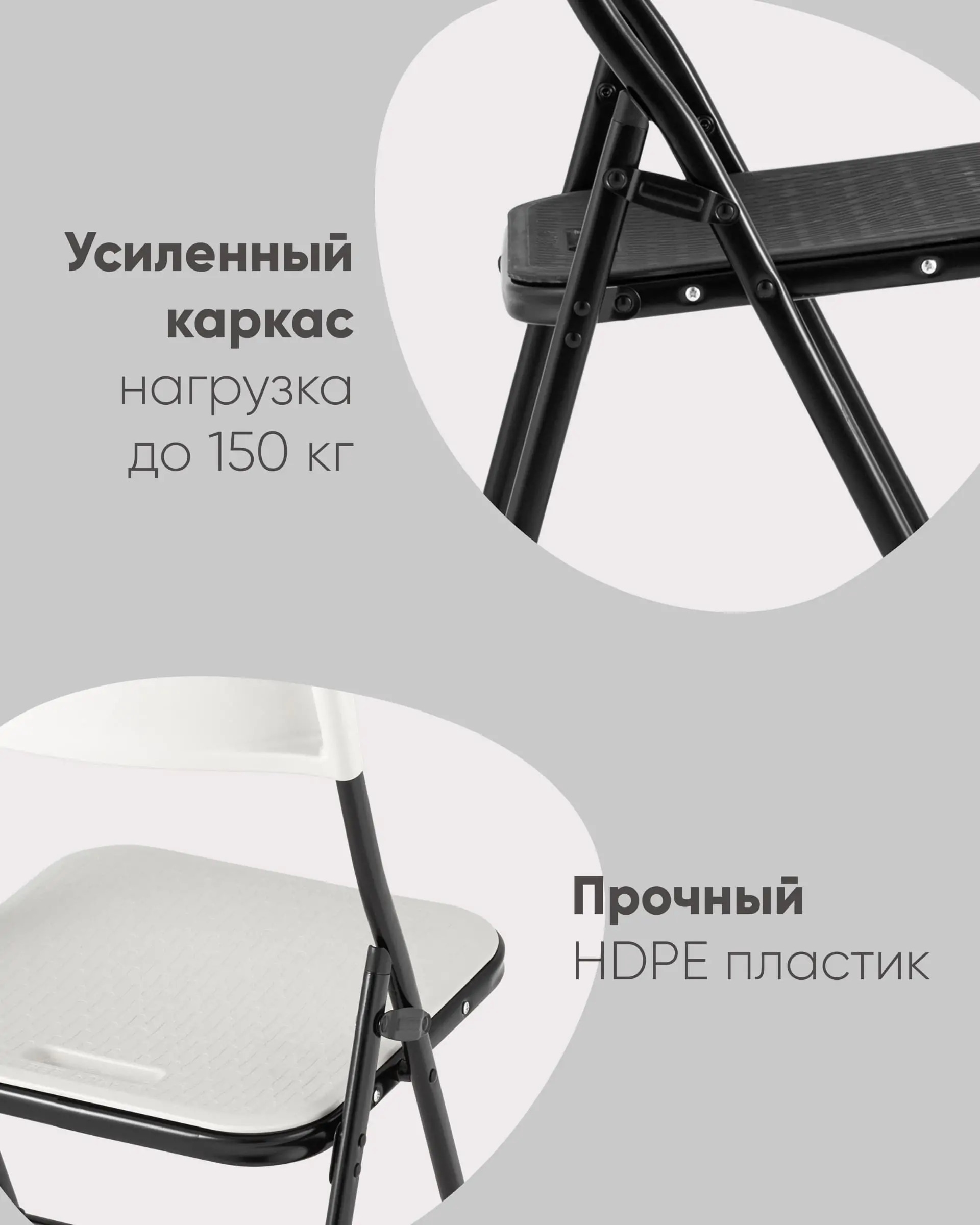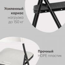 Цвет белый, сиденье и спинка выполнены из пластика HDPE – считается одним из более безопасных видов пластика. HDPE пластик выдерживает высокие нагрузки и не трескается при ударной нагрузке. Усиленный металлический каркас выдерживает до 150 кг.