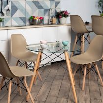 Благодаря сочетанию пластика с металлом и деревом изделие органично вписывается практически в любую среду, делая обстановку более естественной и «живой». Еще одно достоинство модели – удобная для обеденного стола высота, что позволяет использовать их в кафе и ресторанах.