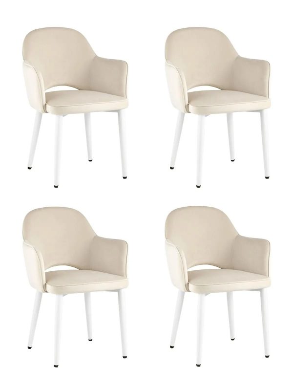 Комплект из четырех стульев. Интересное сочетание современного дизайна и вневременной мебельной классики. Обивка из мебельной велюровой ткани, мягкой, бархатистой и очень приятной на ощупь. Мебельная ткань велюр – очень практичная и устойчивая к истиранию. Ножки из металла белого цвета.