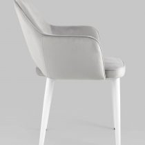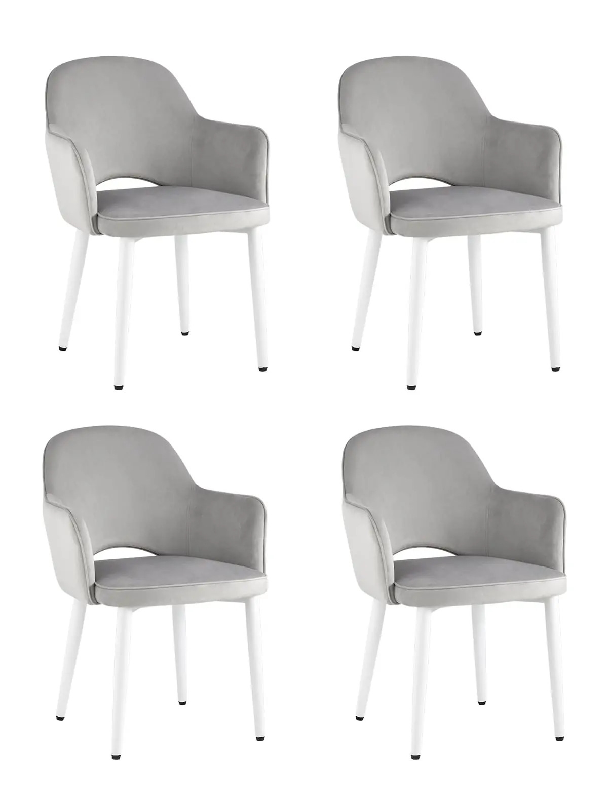 Комплект из четырех стульев. Интересное сочетание современного дизайна и вневременной мебельной классики. Обивка из мебельной велюровой ткани, мягкой, бархатистой и очень приятной на ощупь. Мебельная ткань велюр – очень практичная и устойчивая к истиранию. Ножки из металла белого цвета.