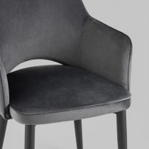 Комплект из четырех стульев. Интересное сочетание современного дизайна и вневременной мебельной классики. Обивка из мебельной велюровой ткани, мягкой, бархатистой и очень приятной на ощупь. Мебельная ткань велюр – очень практичная и устойчивая к истиранию. Ножки: металлические, черного цвета.