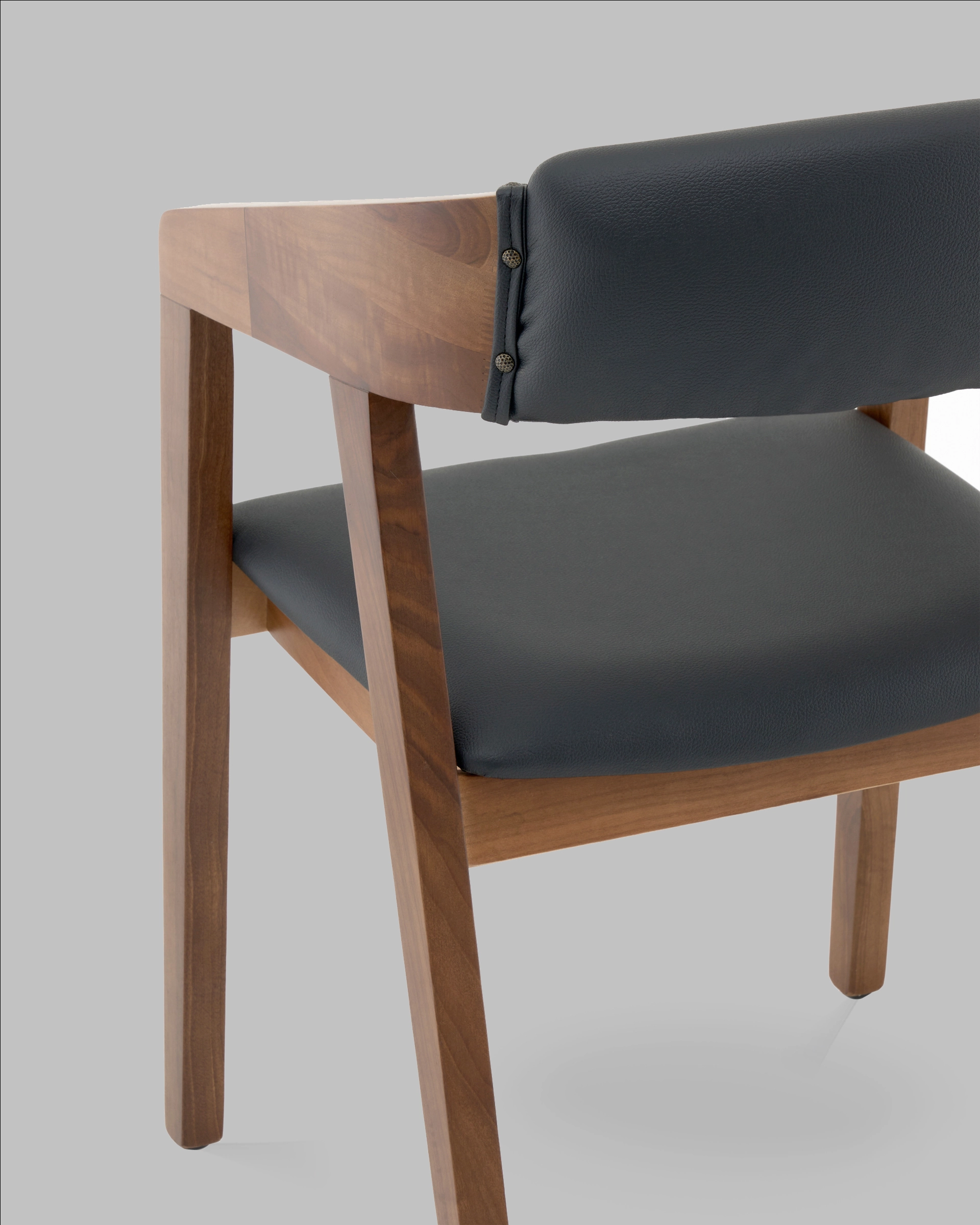 Отличительная особенность — оригинальная спинка с накладкой из чёрной экокожи. Мягкая вставка фиксируется декоративными элементами, создавая интересный акцент и усиливая характер изделия. Это не только стильный элемент, но и дополнительный комфорт для спины.