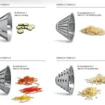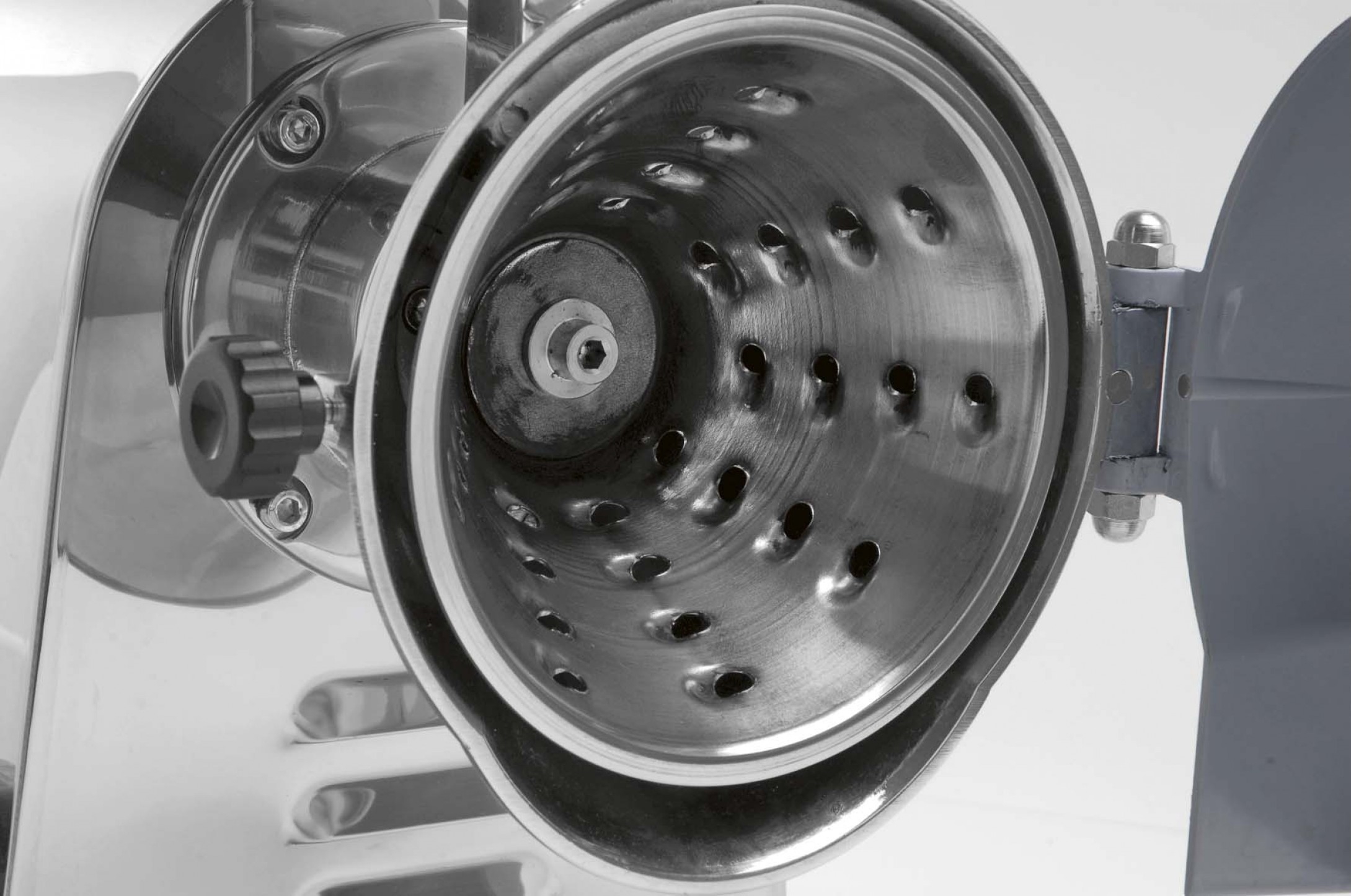 • насадка из нержавеющей стали с отверстиями 7 мм, опционно: насадки (конические ножи) с отверстиями 2,5 мм, 4 мм, нарезание ломтиков 2 мм;