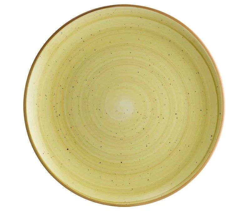 Тарелка круглой формы изготовлена из прочного фарфора премиум класса. Она вручную окрашена в желтый цвет с крапинами, нижняя часть белая. Сверху тарелка покрыта глазурью и дважды обожжена, что придает ей износостойкость и устойчивость к сколам краев.