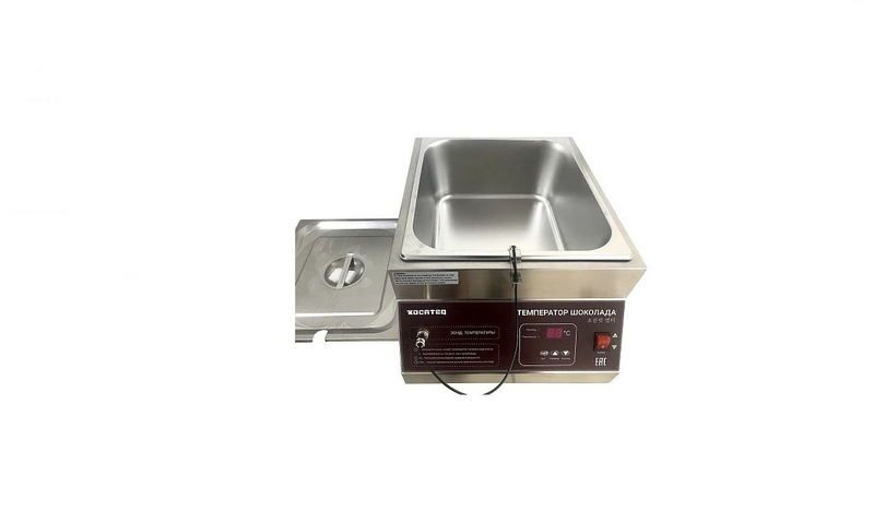 Kocateq DHC meltingchoc miniпредставляет собой темпер для шоколада. Оборудование выполнено в виде темперирующей ванны, оно предназначено для плавления и поддержания в горячем виде шоколада, приготовления глазури. Аппарат относится к профессиональному классу, может использоваться для оснащения торговых точек, пунктов общественного питания. В конструкции предусмотрена ванна под гастроемкость, электронный термостат для регулировки температуры, термощуп. Нагрев осуществляется за счет пластик. В качестве материала изготовления корпуса применяется нержавеющая сталь марки AISI201, пластины произведены из алюминия.