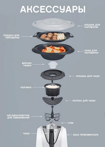 - База, миксерная чаша из нержавеющей стали объемом 2,2 литра (1 шт.), четырехлопастной нож из нержавеющей стали, насадка-бабочка для смешивания, крышка для насадки-бабочки, корзина для продуктов, крышка чаши с мерным колпачком, пароварка, поддон для пароварки, крышка для пароварки, приставка «Варома», книга рецептов.