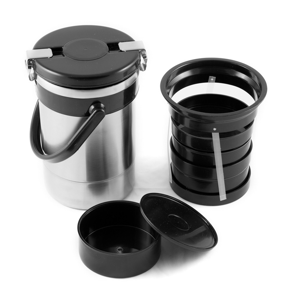 Термос с широкой горловиной с тремя пластиковыми контейнерами с крышками из полипропилена, объёмом 400 мл каждый. В них можно разместить три разных блюда, которые удобно есть прямо из контейнеров. У термоса надежная крышка с металлическими замками.
