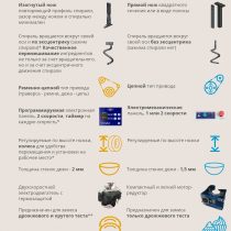Корпус аппарата выполнен из конструкционной стали с защитным полимерным покрытием. Спираль, емкость и нож выполнены из нержавеющей стали марки AISI304. Замешивание происходит в несъемной деже объемом 120л. Предусмотрено 2 скорости вращения, для каждой из них оператор может задать таймер.