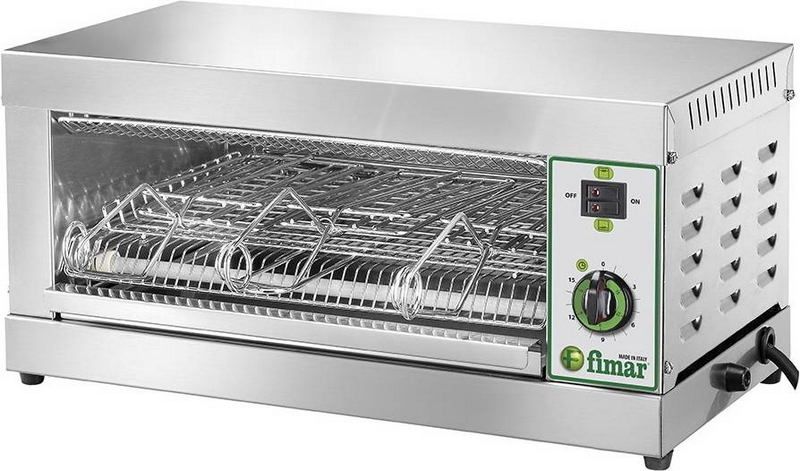 Тостер профессиональныйFIMAR TOP/3предназначен для подогрева и поджарки кусочков хлеба, для разогрева пиццы, сэндвичей, полуфабрикатов, гамбургеров, колбас, фаршированных тостов, пиадин и др. на предприятиях общественного питания и торговли. Оснащен нагревательными элементами с кварцевыми трубками и таймером на 15 минут. Корпус выполнен из нержавеющей стали.