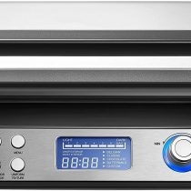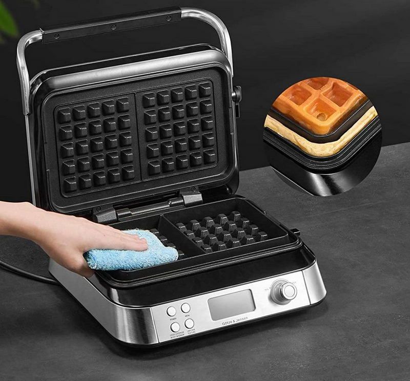 Конструкция электровафельницы включает в себя удобную панель управления с цифровым дисплеем. Поверхности для жарки изготовлены из прочного алюминия с антипригарным покрытием. Корпус прибора выполнен из нержавеющей стали, которая отличается устойчивостью к коррозии, и прочного пластика. Выбирая эту модель, вы приобретаете надежное и долговечное устройство для приготовления вафель.