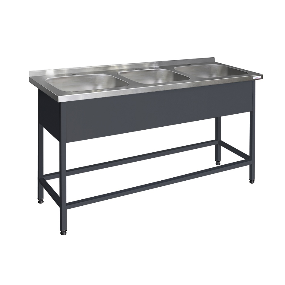 Ванна моечная трехсекционная Финист ВМЭц-3 (1700х500х850)изготавливается на сварном каркасе. Сварная труба и фартук с 3-х сторон выполнены из стали с полимерно-порошковым покрытием. Оснащены регулируемыми по высоте опорами для компенсации неровностей пола.