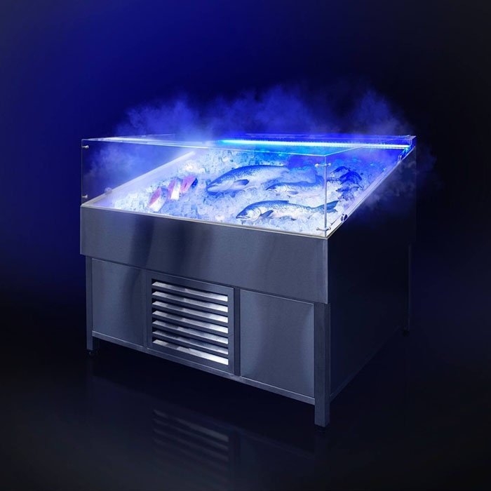 Витрина для выкладки рыбы на льду с охлаждением и системой туманообразования Финист VFgt/1500предназначена для охлаждения и демонстрации рыбы и морепродуктов на льду. Для поддержания товарного вида продуктов применяется система туманообразования с ультразвуковой системой увлажнения воздуха. При таком методе увлажнения размер капли получается 5 мкм, что позволяет применять туман в открытых и закрытых витринах. Туман отлично выполняет функцию увлажнения продуктов и привлекает внимание покупателей.