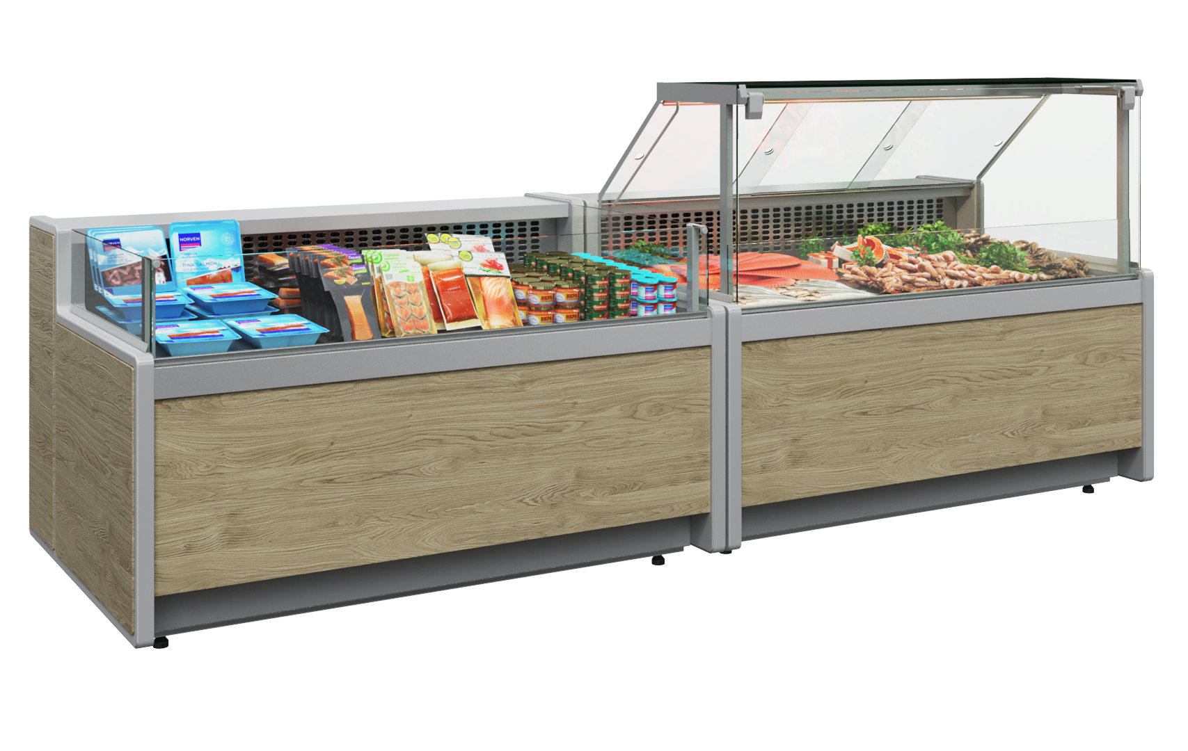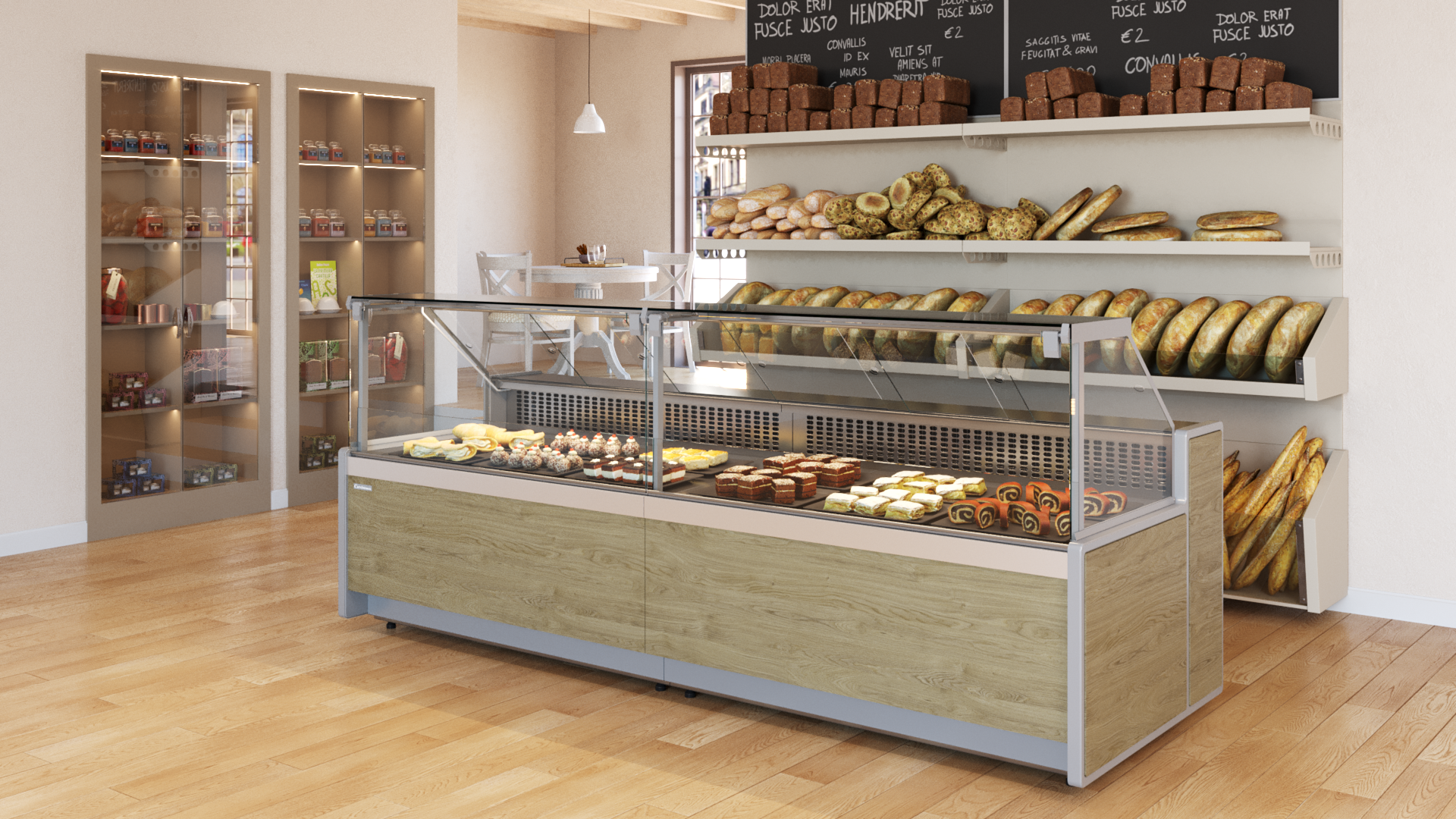 Холодильная витрина GC111 Gelios с подъемным стеклом на газлифтах. Исполнение передней панели: ламинированный МДФ 1010 (Мариель). Стандартная комплектация: