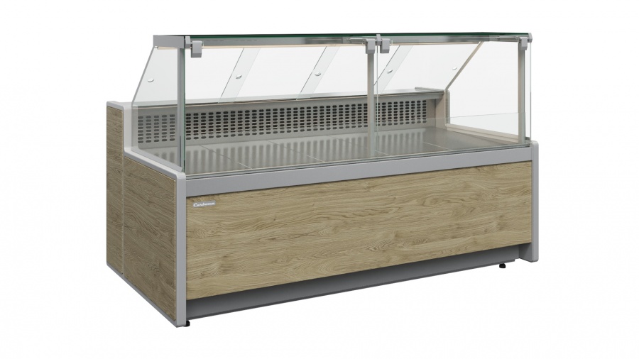 Холодильная витрина GC111 Gelios с фиксируемым фронтальным стеклом. Исполнение передней панели: ламинированный МДФ 1010 (Мариель). Стандартная комплектация:
