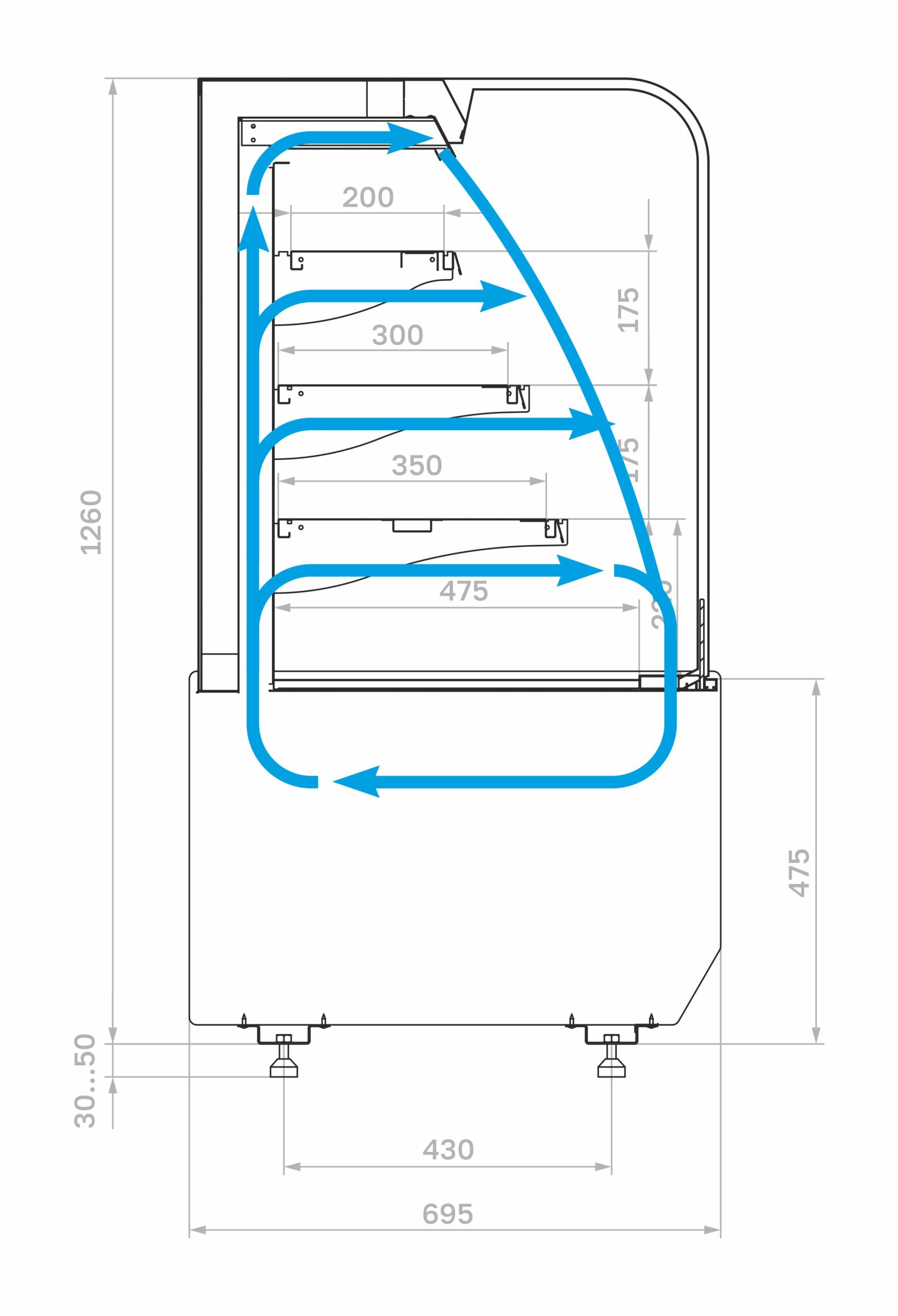 Стандартная комплектация холодильной витрины Carboma Radius KR70 VM 0,6-2 STANDARD открытая, горка (9005)