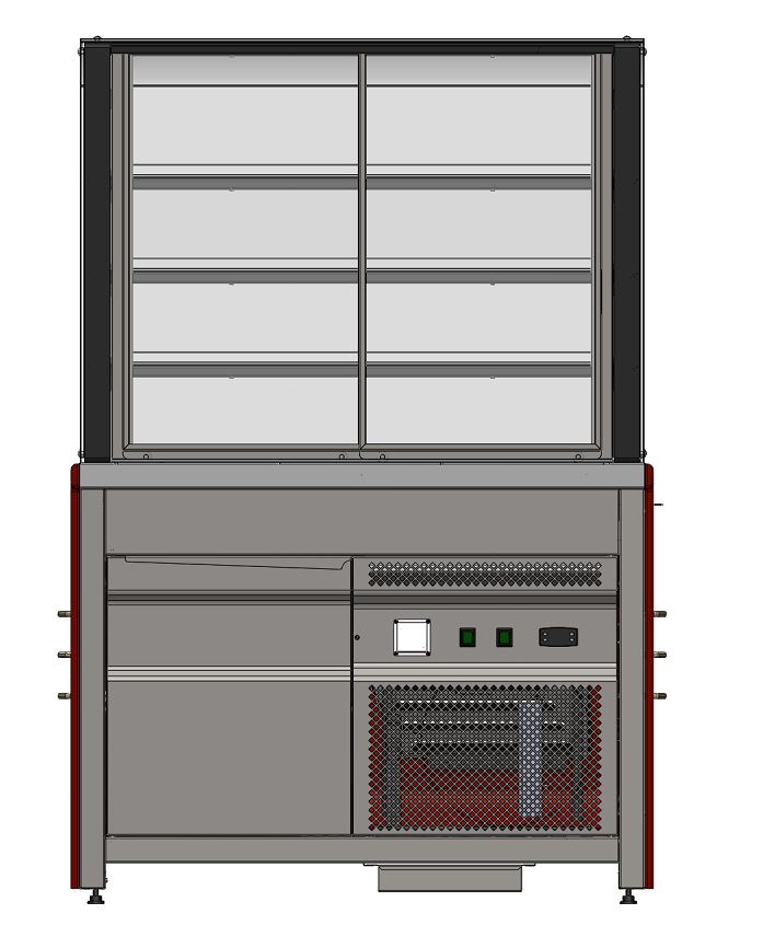 - Со стороны персонала в витрине есть ниша для инвентаря и розетка с защитной крышкой. Как дополнительная опция ниша может быть снабжена створчатой дверкой;