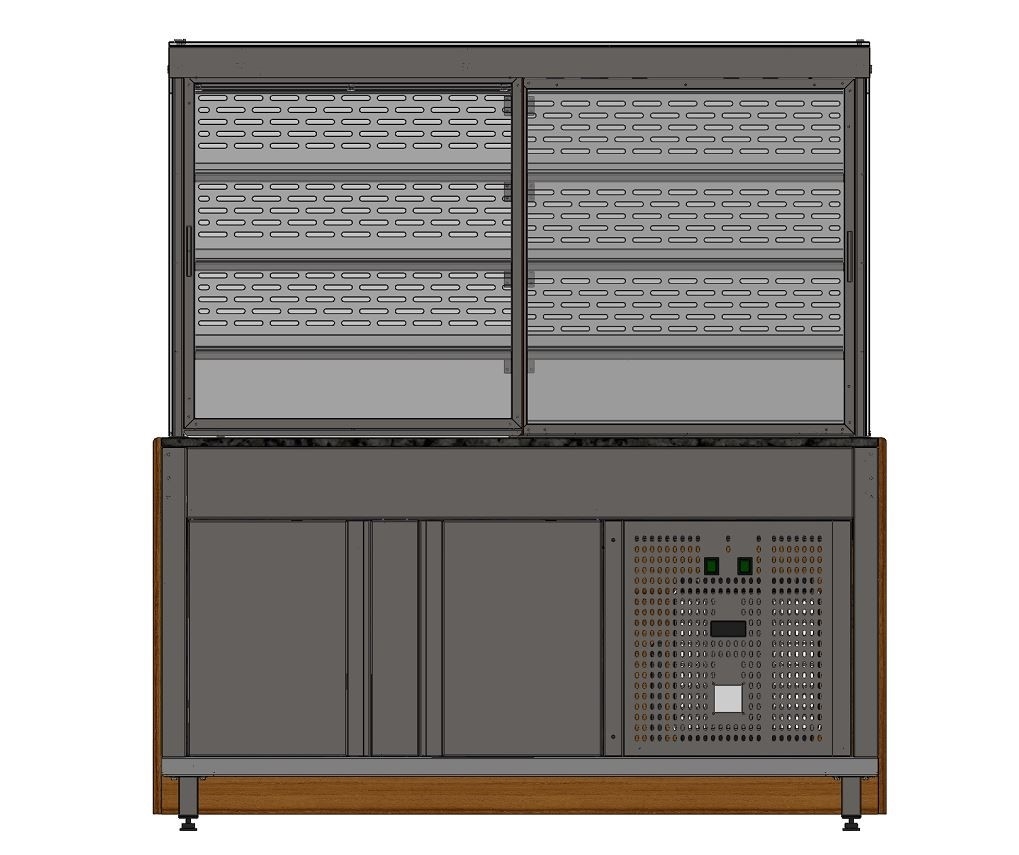 - Доступ к продуктам со стороны рабочего персонала осуществляется с помощью раздвижных створок витрины, со стороны потребителя доступ через откидные крышки;
