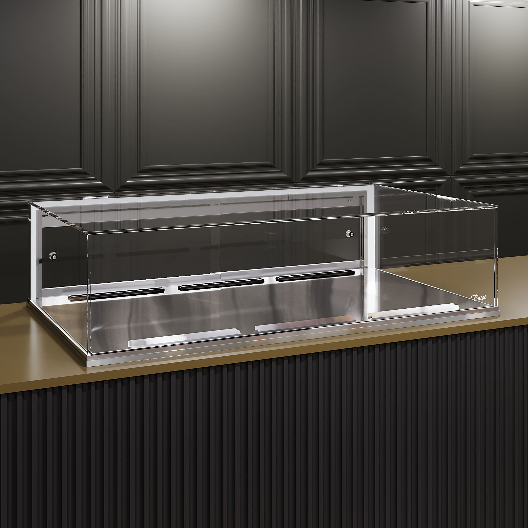 Встраиваемая кондитерская витрина Финист Glassier G-11/5/3 монтируется в столешницу из любого материала и служит для кратковременного хранения и продажи кондитерских изделий при температуре от +5 до +8°С.