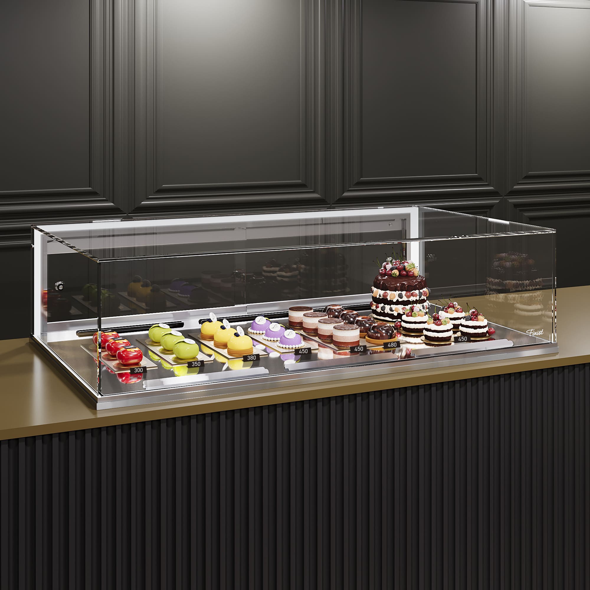 Встраиваемая кондитерская витрина Финист Glassier G-12/6/3 монтируется в столешницу из любого материала и служит для кратковременного хранения и продажи кондитерских изделий при температуре от +5 до +8°С.