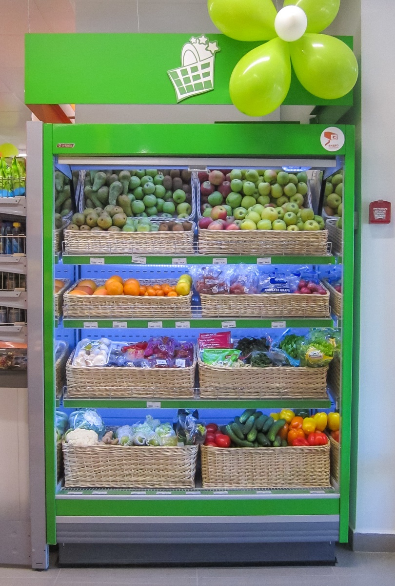 - Фруктовая: 4 ряда полок по 400 мм, с регулируемым наклоном; ценникодержатели пластиковые; наклонное зеркало.