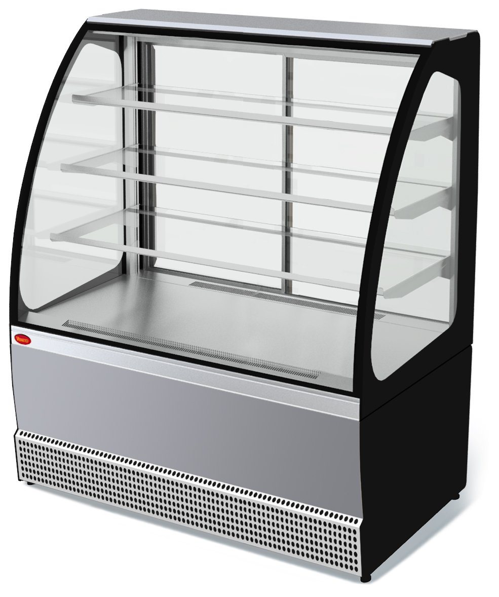 Veneto VS-0,95 new — холодильная витрина для кондитерских изделий, со встроенным агрегатом, с тремя полками, с динамическим охлаждением. Размеры витрины: длина 950 мм, ширина 740 мм, высота 1265 мм.