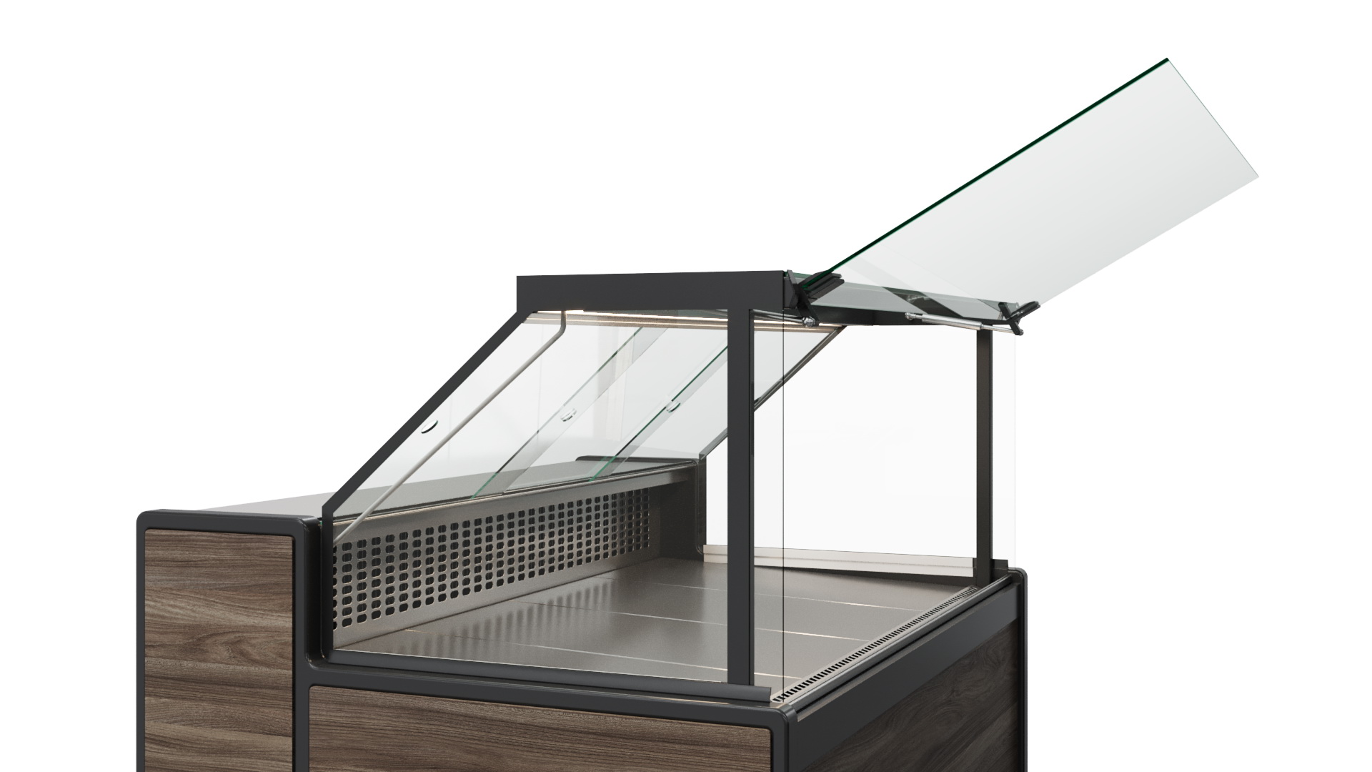 Холодильная витрина GC111 Gelios с подъемным стеклом на газлифтах. Исполнение передней панели: ламинированный МДФ 1008 (Темный дуб). Стандартная комплектация: