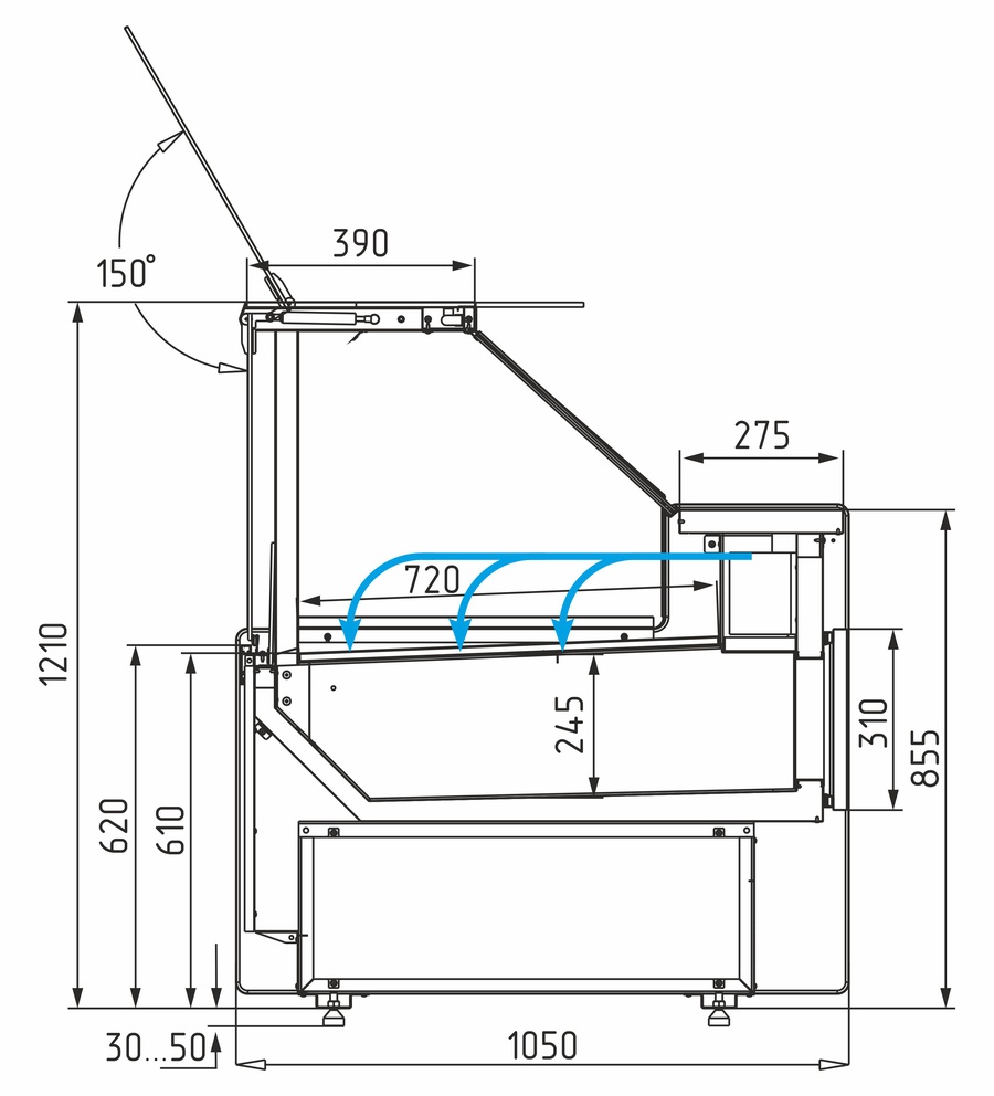 - 2-ступенчатые поддоны для выкладки (общая высота – 120 мм, общая глубина – 480 мм)