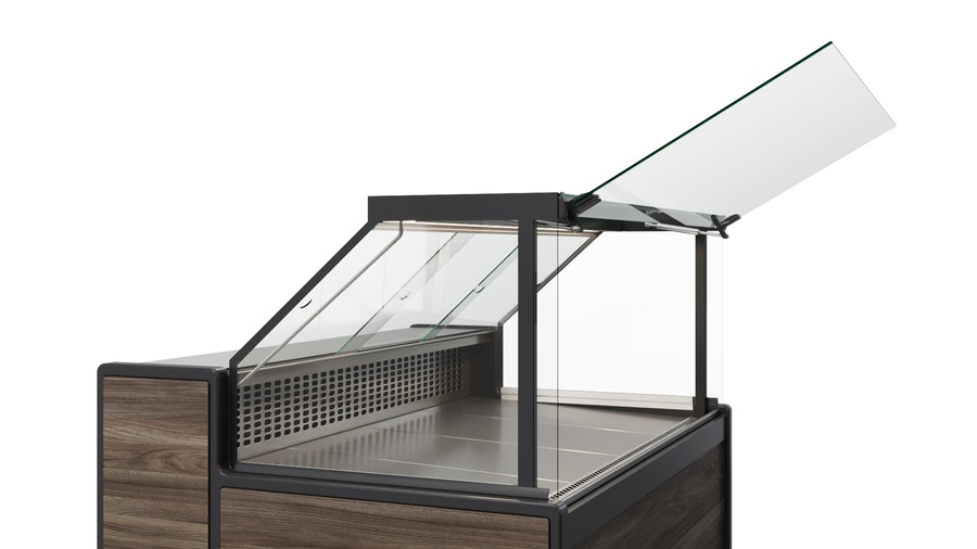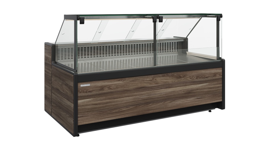 Холодильная витрина GC111 Bavaria 3 с подъемным стеклом на газлифтах. Варианты исполнения передней панели: ламинированный МДФ 1008 (темный дуб), 1010 (мариель). Стандартная комплектация: