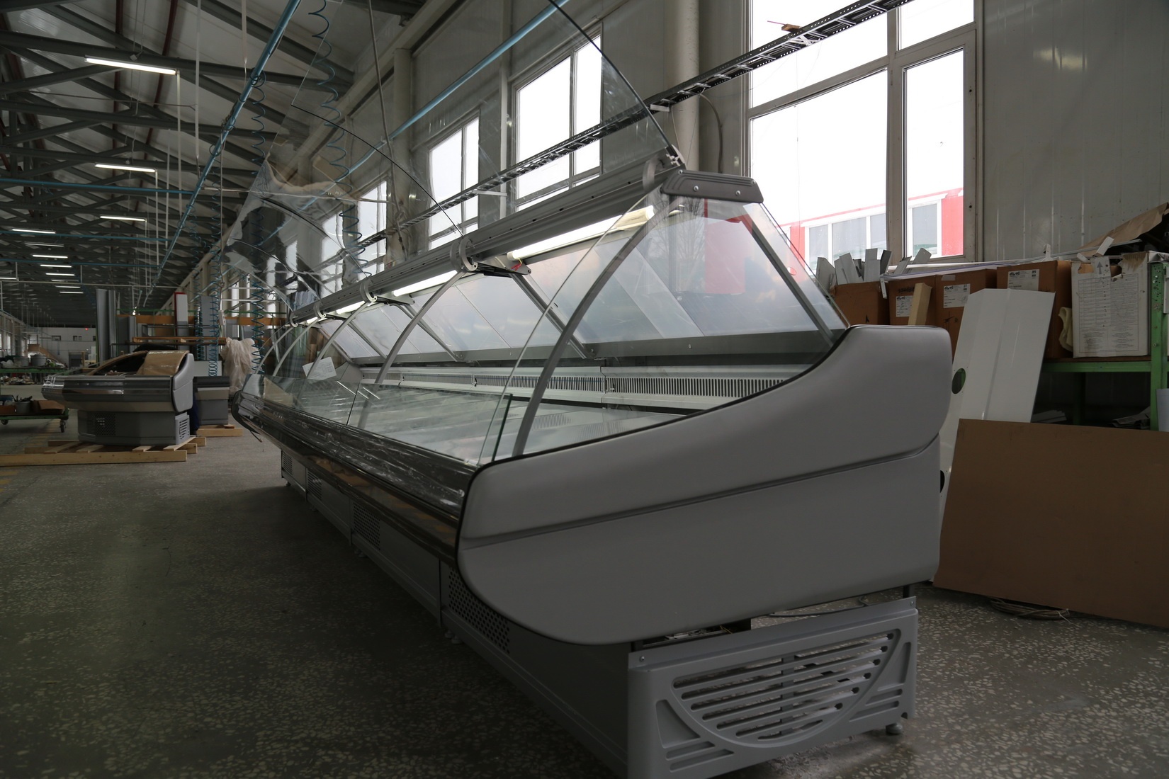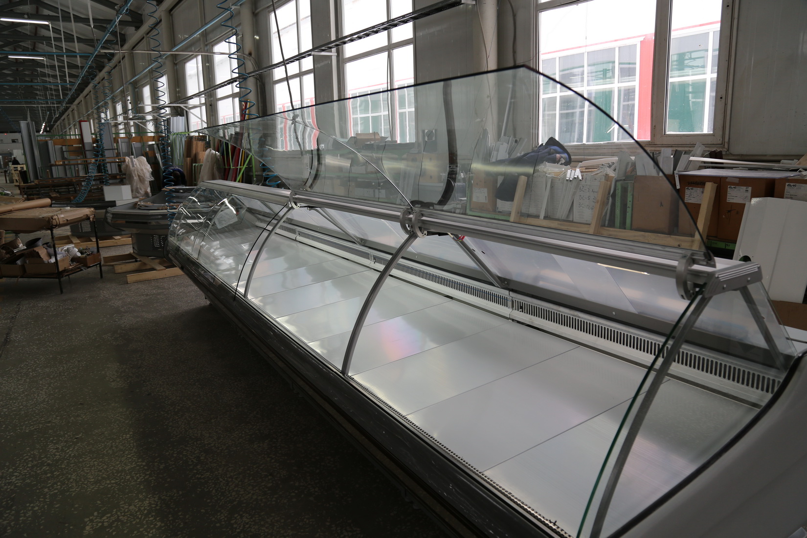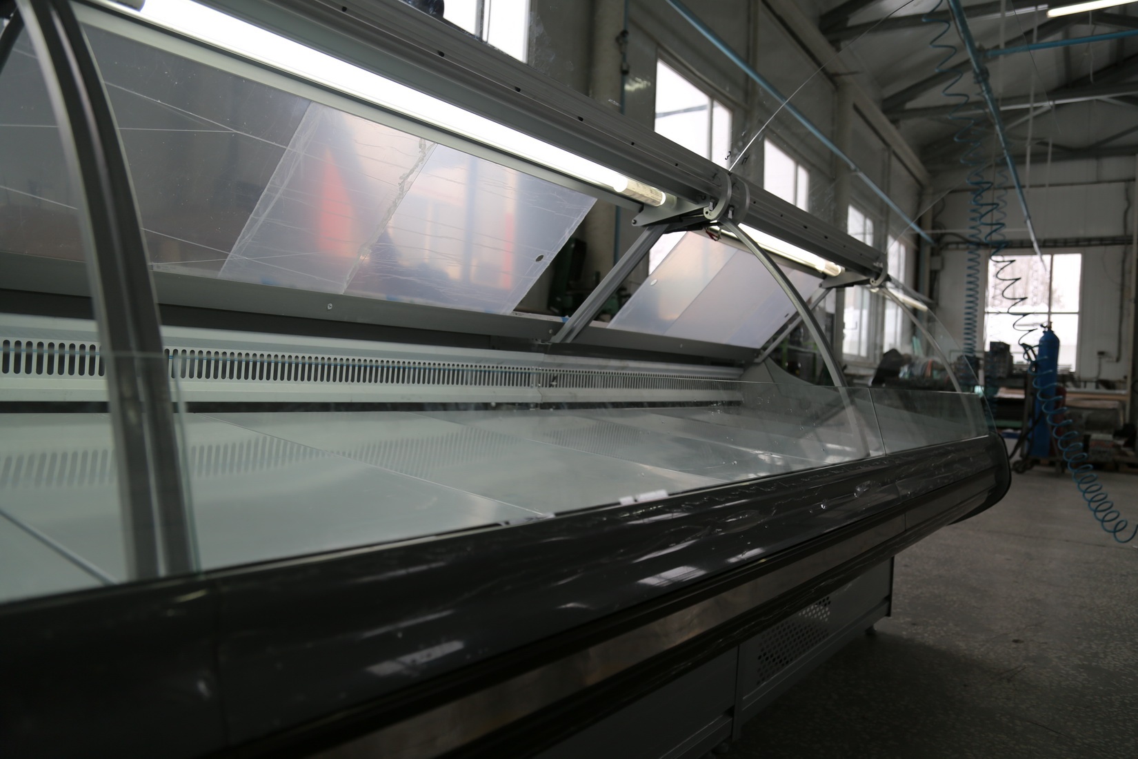 Отличие холодильных витрин серии «Титаниум Lux» от «Титаниум»: подъем фронтального стекла на гидролифтах.