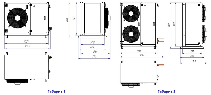 ККБ на базе 4-полюсных вентиляторов. Среднетемпературный агрегат (при t исп -10ºС, t конд. +45ºС, перегрев 5К, переохл. 0К), на базе цифрового компрессора “Copeland”.