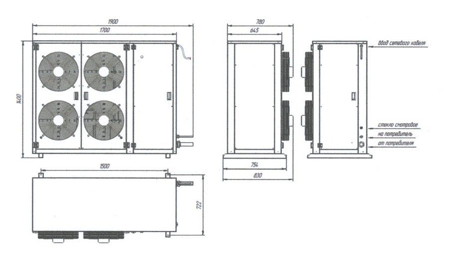 ККБ 4-го габарита на базе 6-полюсных вентиляторов. Низкотемпературный агрегат (при t исп -30/-35ºС, t конд. +45ºС, перегрев 5К, переохл. 0К), на базе компрессора “Copeland”.