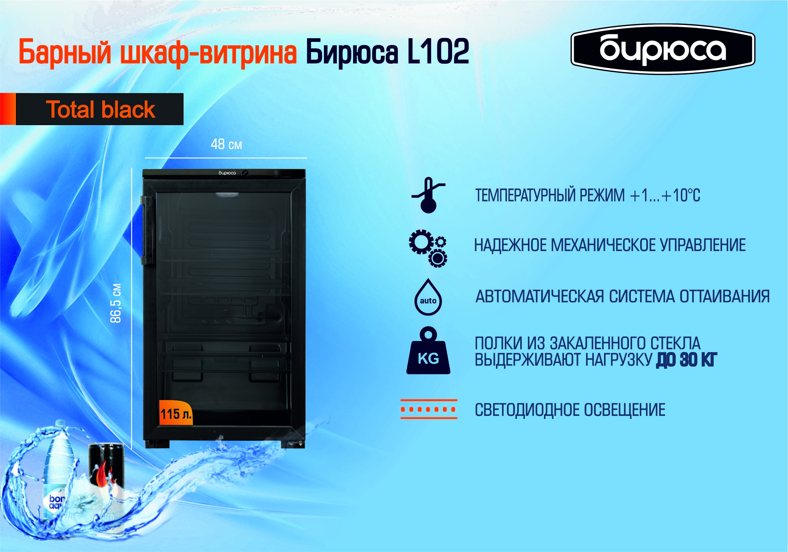 Компактный шкаф-витрина Бирюса L102 со статическим охлаждением. Особенности: