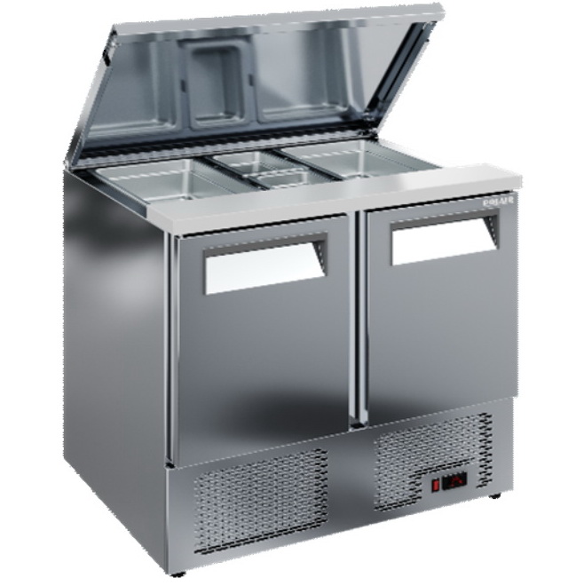 Холодильный стол Polair TMi2GNsal-GСпредставляет собой саладетту — специлизированную среднетемпературную модель, которая используется для изготовления салатов, сэндвичей, закусок на профессиональной кухне. Конструкция стола разработана с учетом максимального удобства повара и оперативного доступа к охлажденным ингредиентам. Хранение продукции возможно как в основном охлажадемом отсеке с двумя глухими дверками, так и в охлаждаемой ванне с гастроемкостями разного размера (в комплект не входят). При необходимости емкости с ингредиентами можно закрыть крышку, в открытом положении она надежно фиксируется.